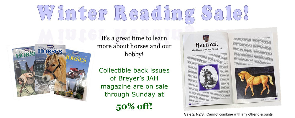 Items go quickly and often sell out. Check back each weekend to see what great models we've added from all our brands including Breyer, CollectA, Schleich, Hagen-Renaker, Peter Stone and more. Click Shop to see them all!
