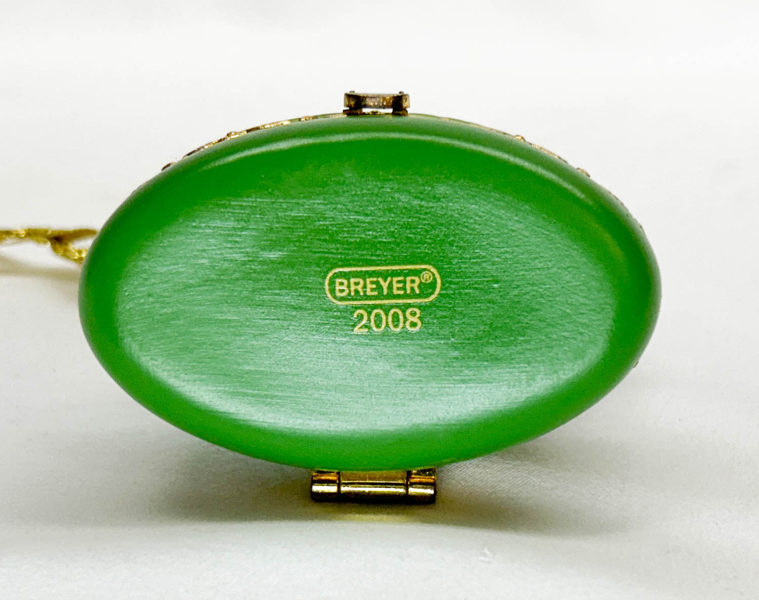 This is a beautiful Breyer porcelain treasure box ornament. It features a rearing bay horse adorned in a red and gold blanket, in front of a holly bush, on a green and metallic gold base. The base is hinged with gold-tone metal trim and opens to reveal a hiding place perfect for jewelry or a note. It was only available in 2008 and is the 1st in the series.