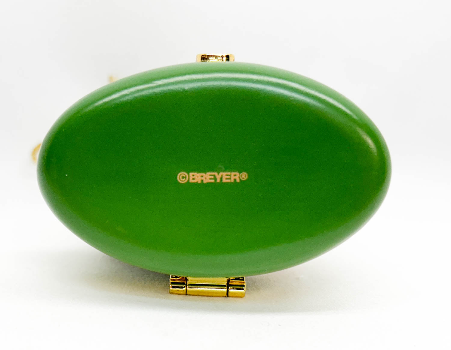 This is a beautiful Breyer porcelain treasure box ornament. It features a darling buckskin horse wearing a big red bow, standing among the presents while talking with Santa, on a green and metallic gold base. The base is hinged with gold-tone metal trim and opens to reveal a hiding place perfect for jewelry or a note. It was only available in 2011 and is the 4th in the series.