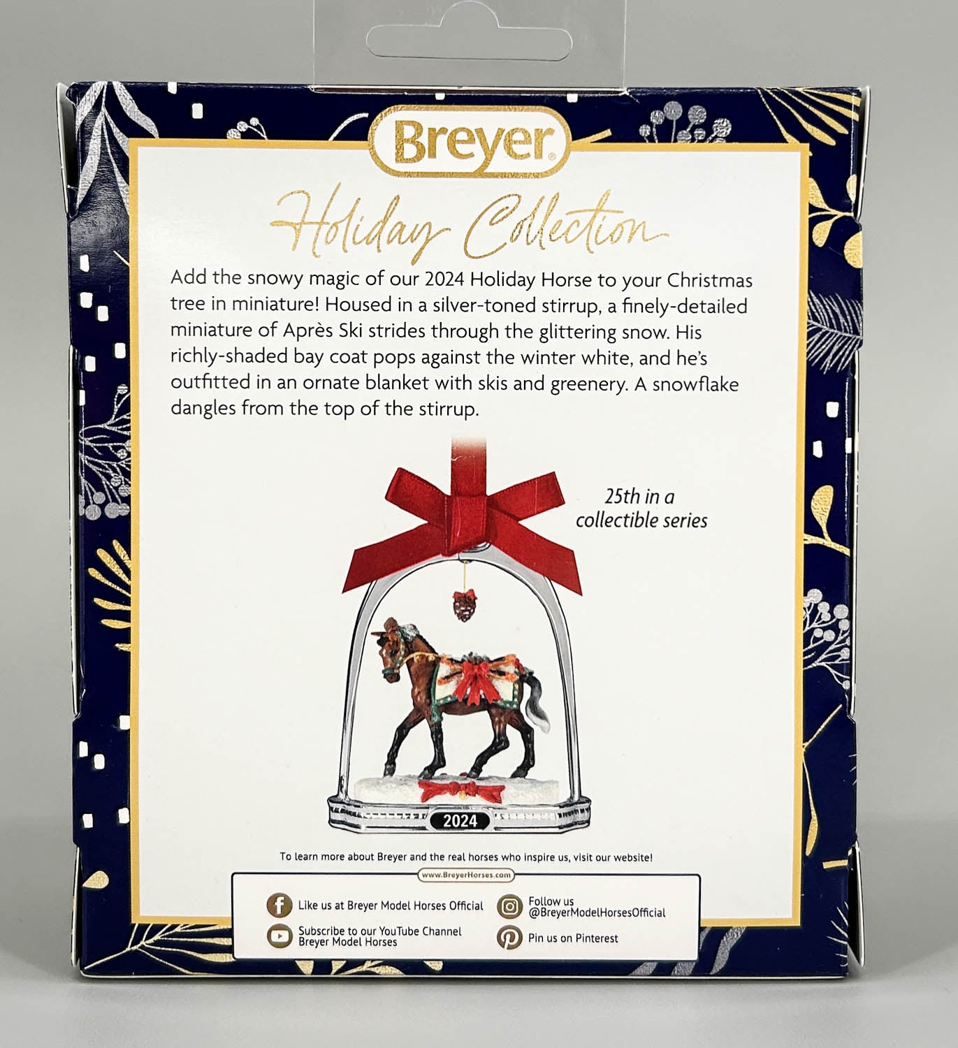 Winter is a time to get outside and enjoy the beauty and peace of freshly fallen snow. Apres Ski is ready to join in, and carries the gift of skis and poles, along with greenery, to inspire you to get out and enjoy the winter air (or imagine it, if you live in warmer climes. 2024's stirrup ornament is a miniature version of Apres Ski, framed in a silvertone horseshoe, with a pine cone hanging above, the year emblazoned at the bottom, and suspended with a red ribbon.