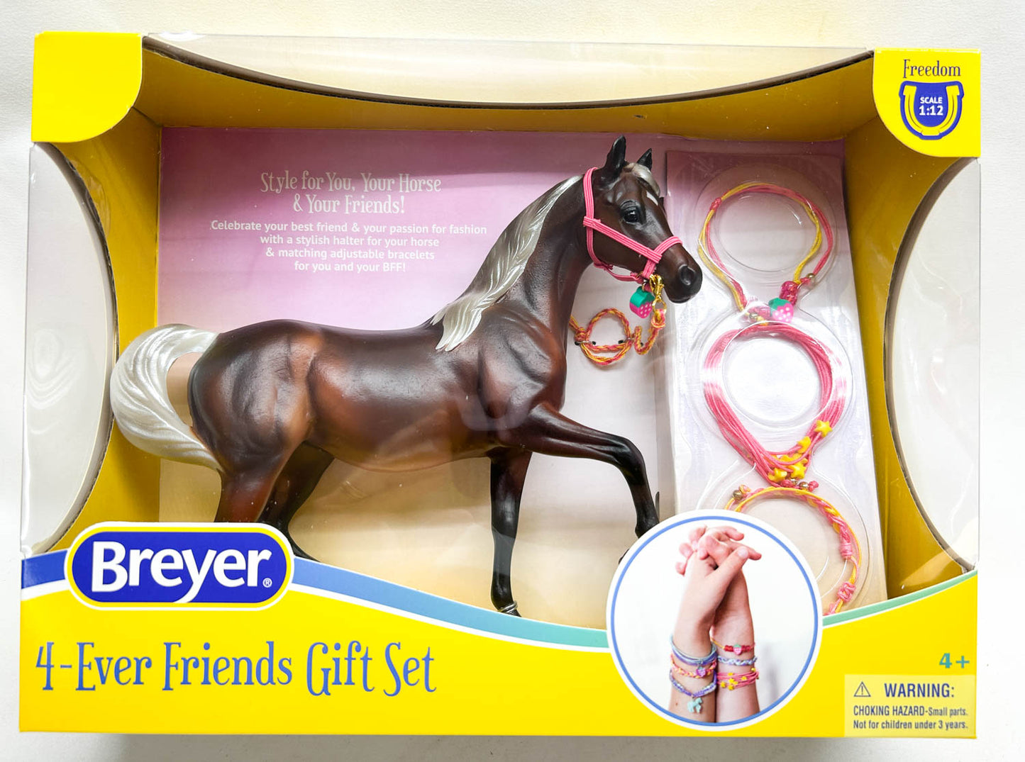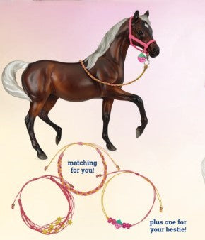 Get in on the Friendship Bracelet craze with this beautiful gift set!  The elegant Arabian Mare wears a silver bay coat for this release, plus a pink halter and lead line.  She brings you three different friendship bracelets to keep or share with friends!  This pretty set joined the Breyer line in June, 2025.