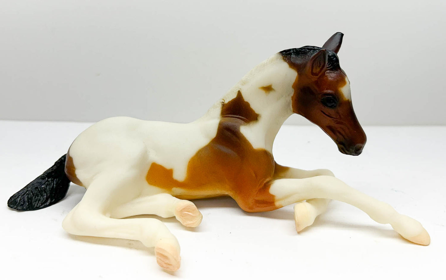 What a beautiful color for this filly! Ashley wore this bay pinto color only in the Great Spirit Mare and Foal Set, produced for JC Penney's Holiday Catalog in 2001. With in her markings hide spirit bears! She has a black and white mane, black tail, buff feet and a big star. They have become hard to find, as they're so cute!