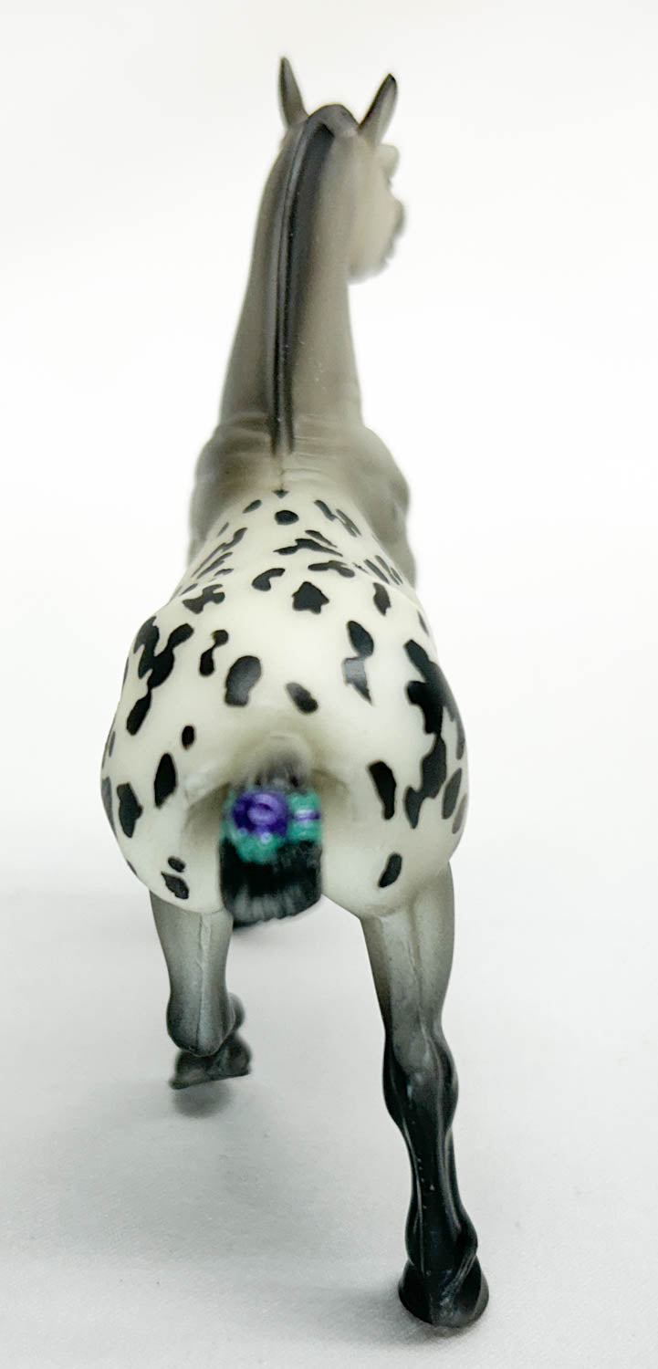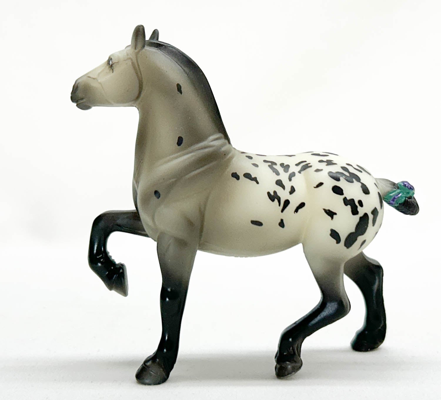 This really pretty Sugarbush Spotted Draft Horse on the Stablemates Belgian mold was only available to members of the Stablemates Collector Club in 2019. She wears a shaded grey coat with lots of masked Appaloosa spots, and sports a teal and purple tail ribbon.