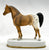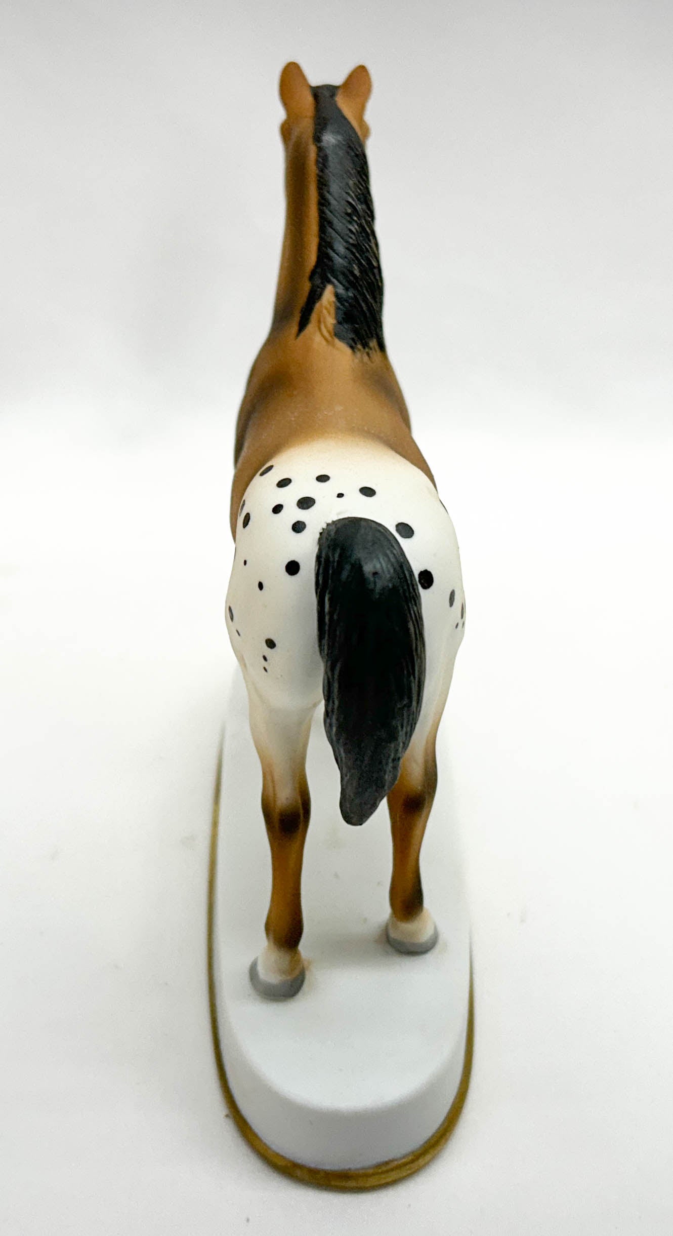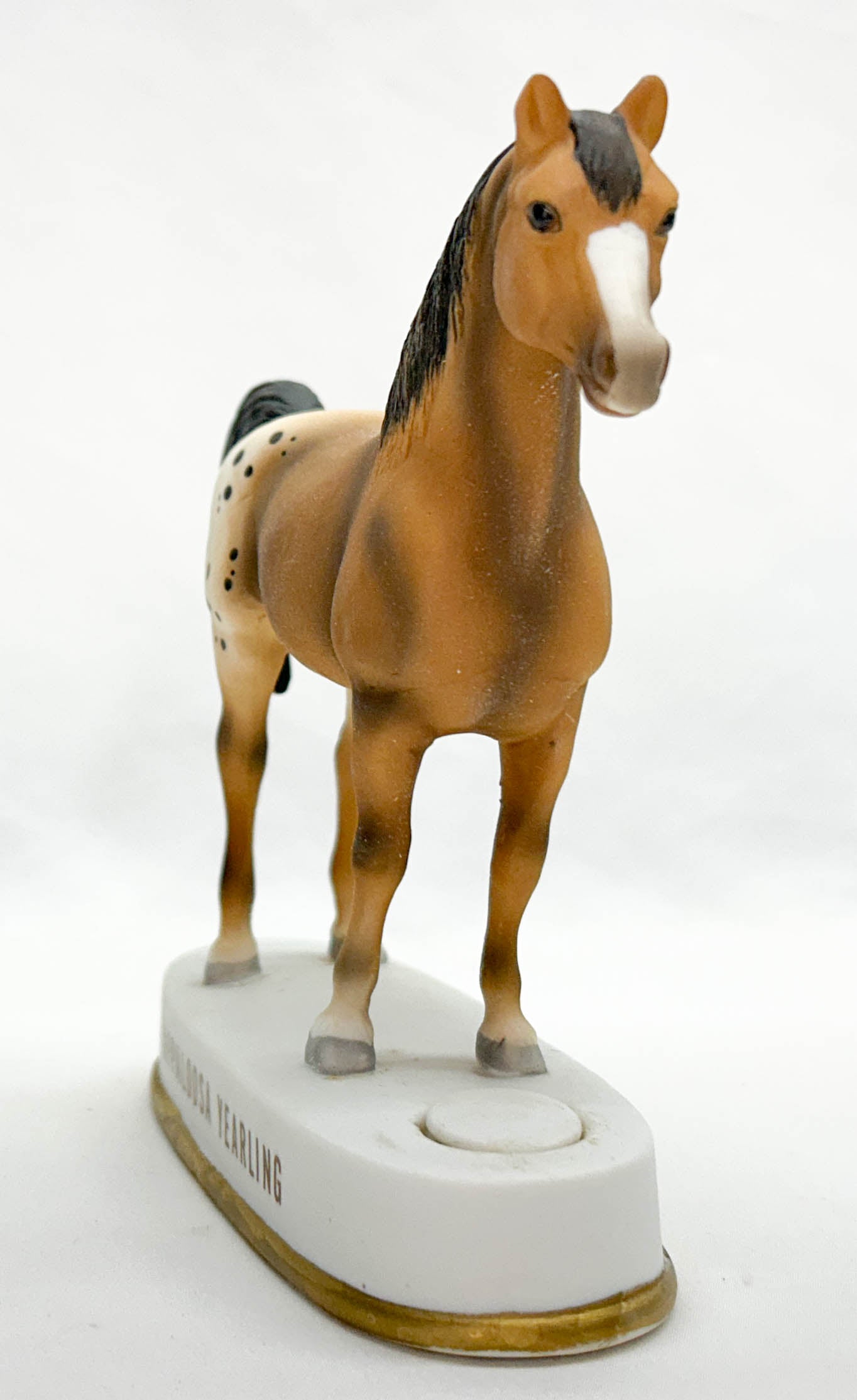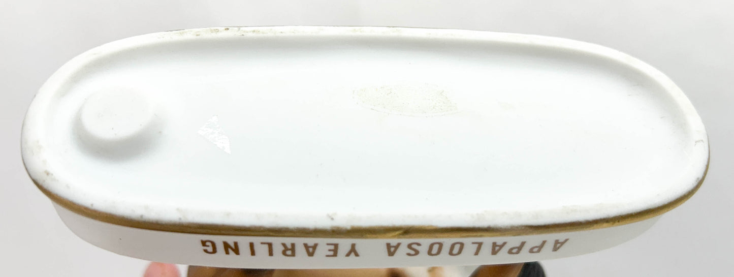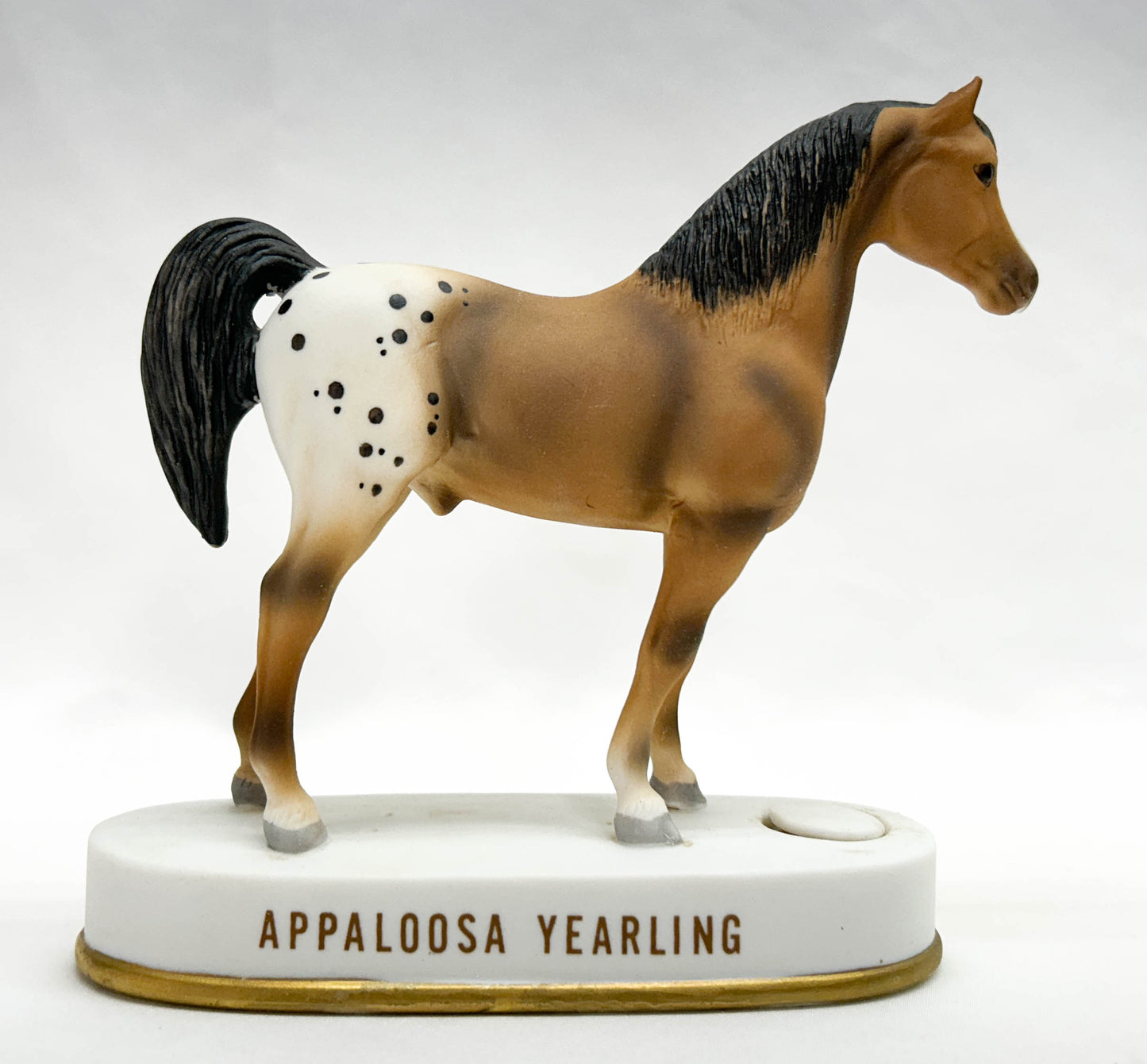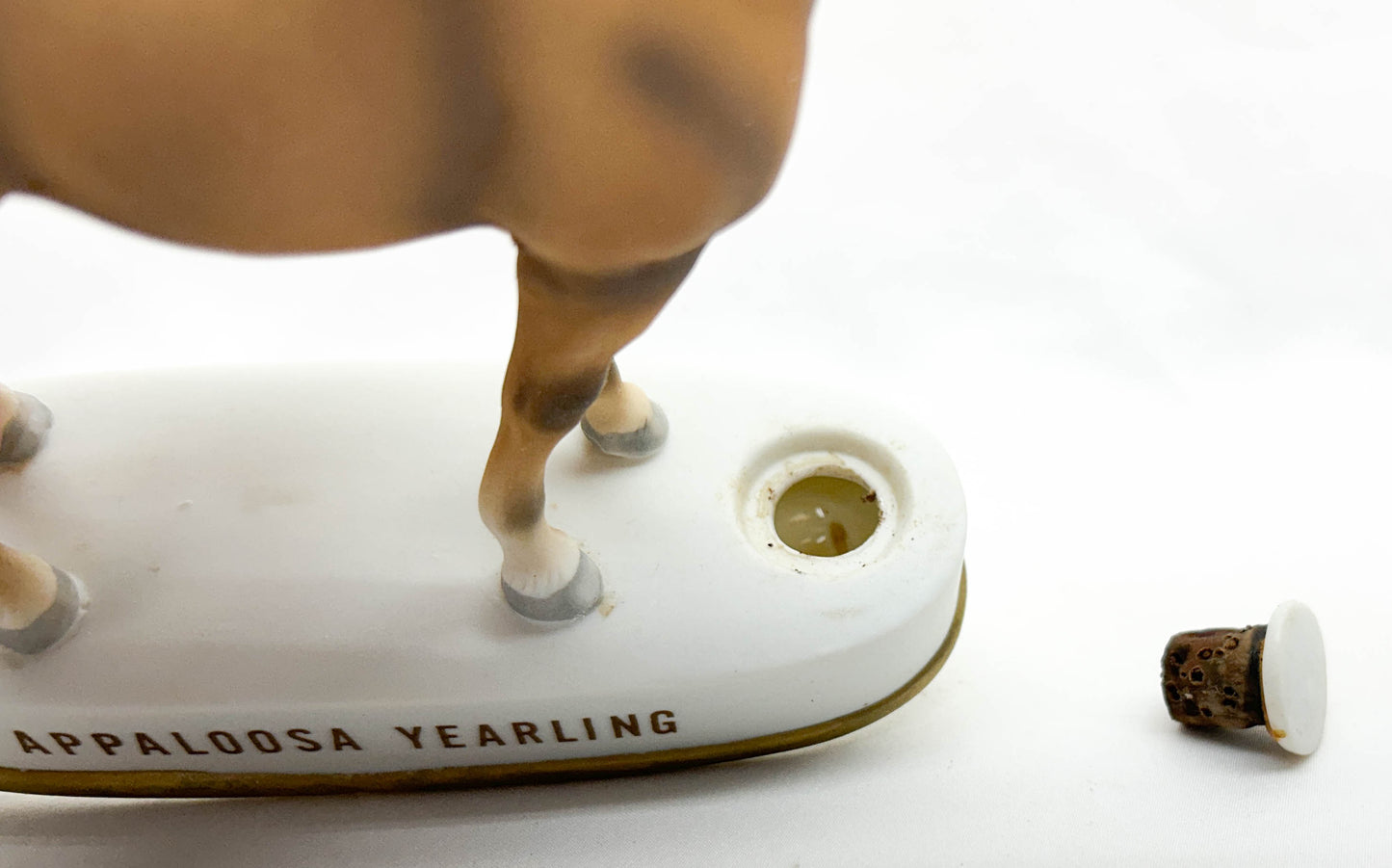 Part of Hoffman Distilling Co's horse decanter series, this "Appaloosa Yearling" is surprisingly well sculpted and well painted! He is similar to the Breyer Family Arabian Mare in position, and similar to Breyer's sandy bay Appaloosa Yearling in color. He is made of white ceramic with a paint job that includes realistic shading and a gold rim around his base. The decanter part itself is the base, though I can't imagine it holding more than 2 ounces. It includes a little round ceramic button with a cork stopper.