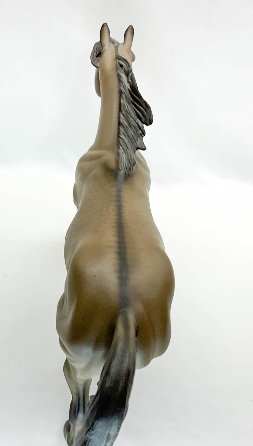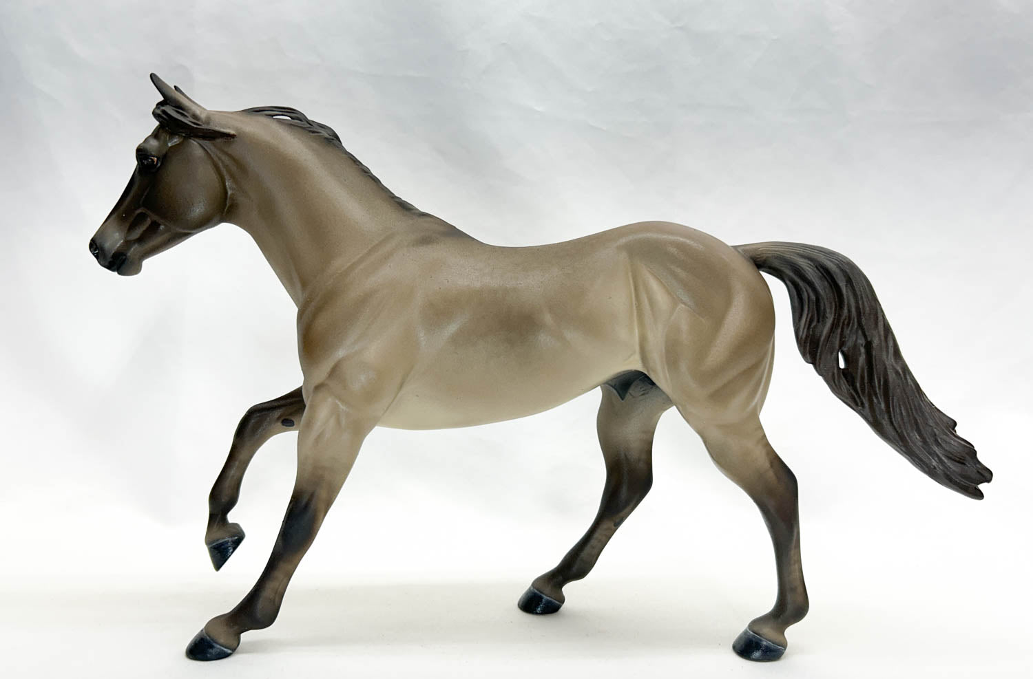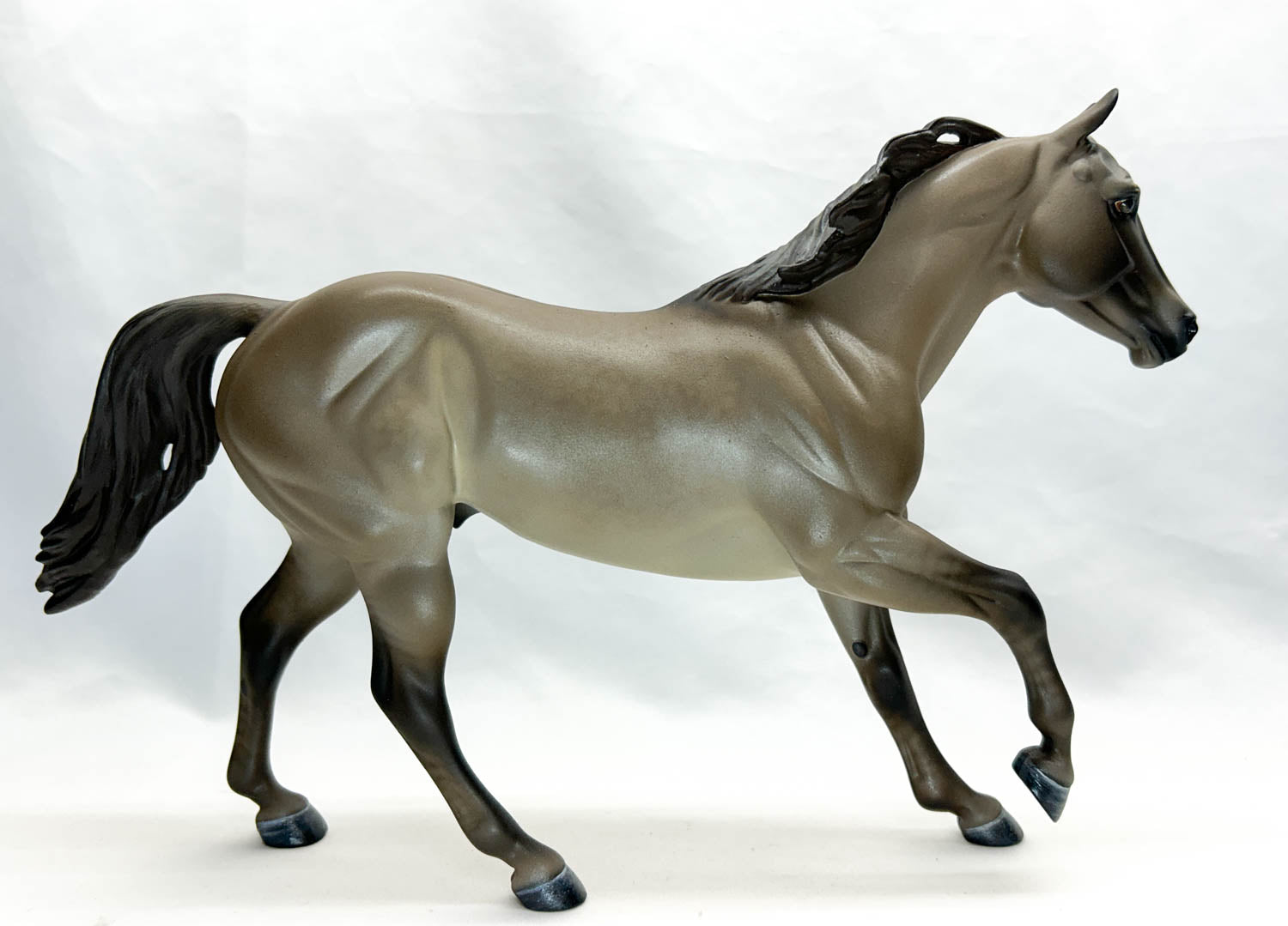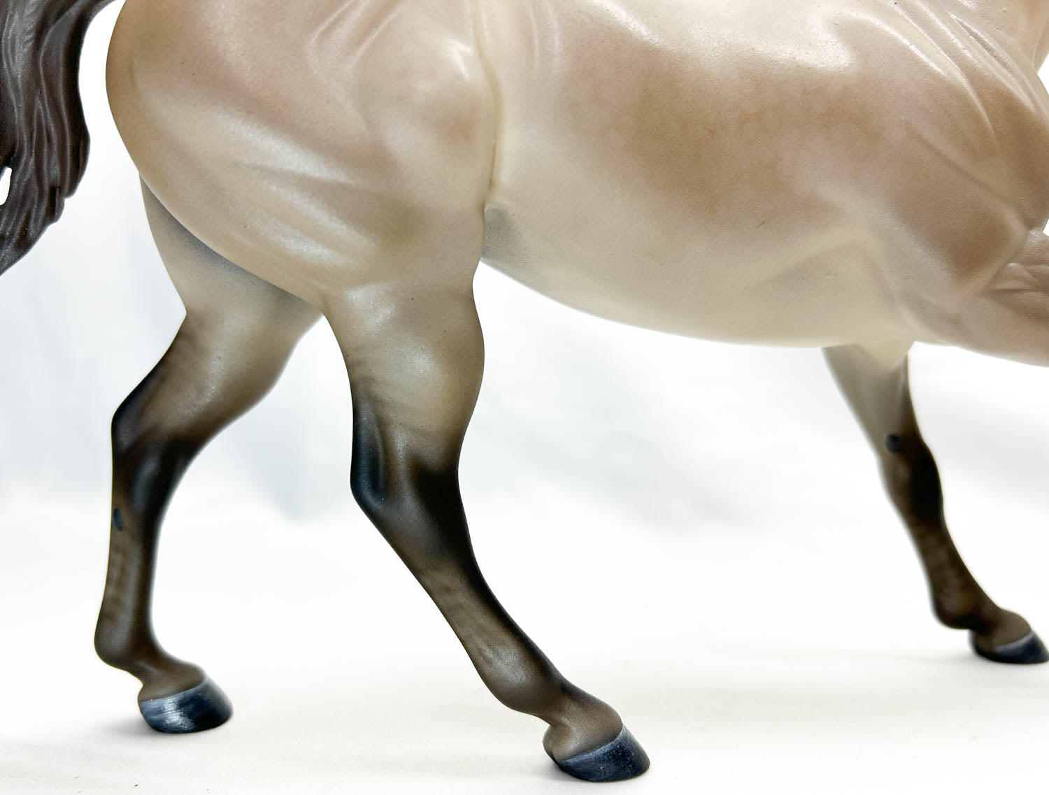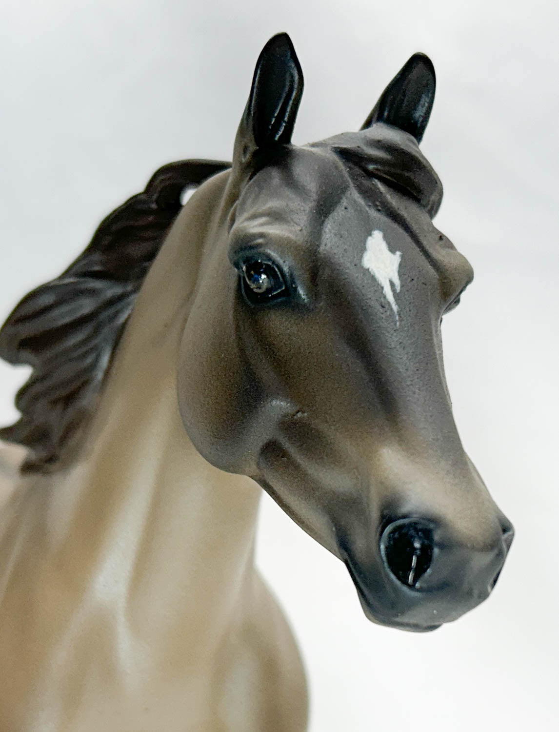 This sweet grullo stallion was customized by artist Amanda Dionne in, or before, 2013. He appears to be in Artist Mint condition with a lovely paint job. His texture is a bit rough (the paint has some "tooth" to it), but he displays beautifully. He features blended dappling, a dorsal stripe with cross-barring, and a really pretty face with charcoal shading and a little star. See the closeup to appreciate his subtle leg barring, hoof details, and dappling!