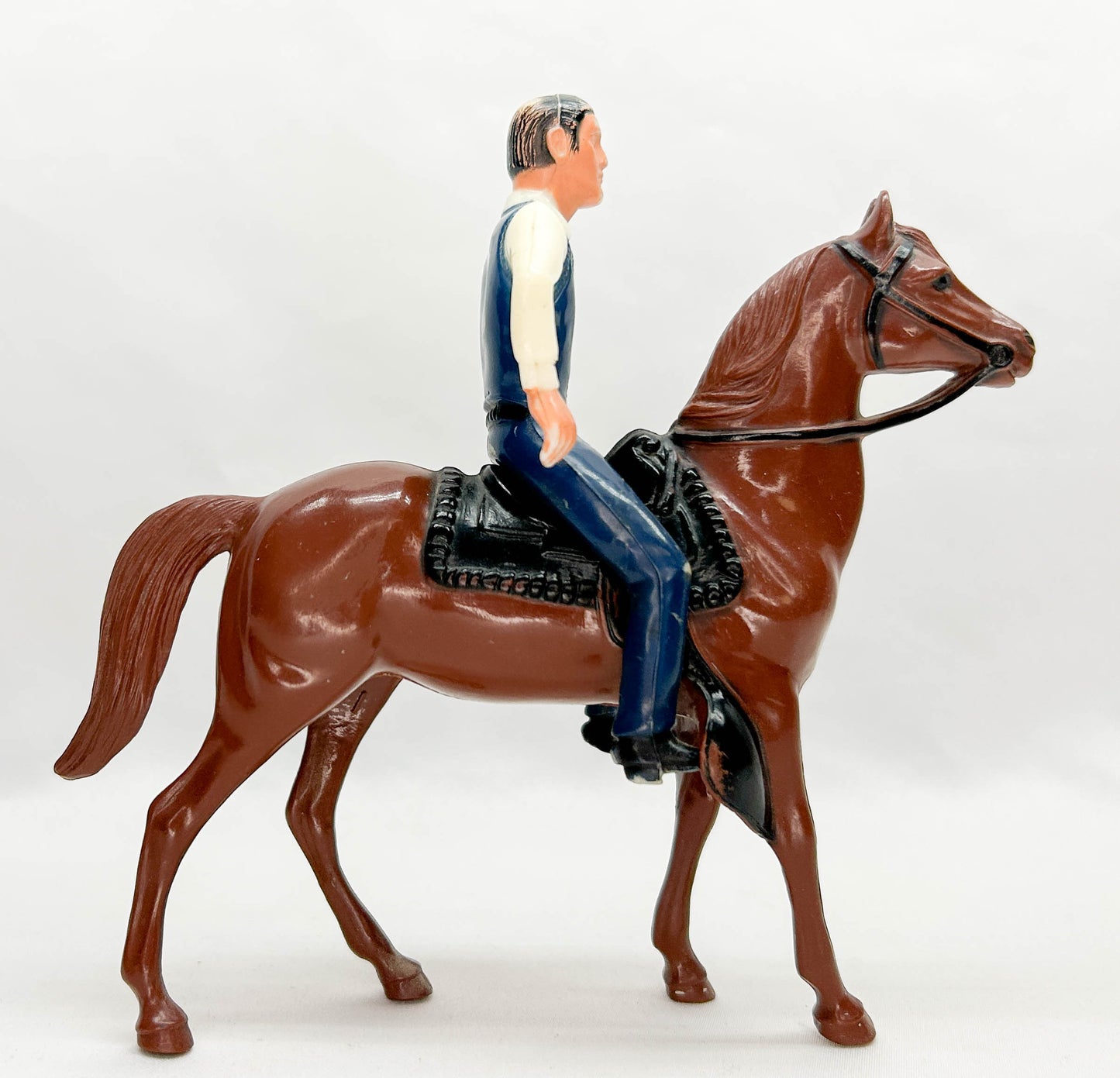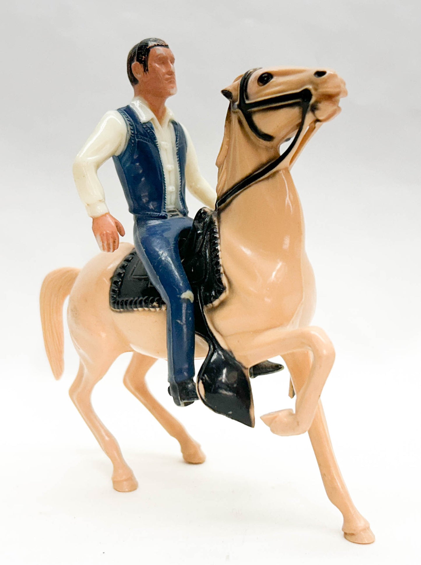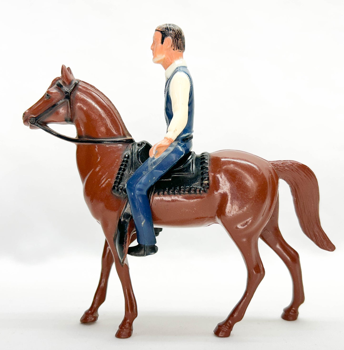 This pair of horses and riders comes from Eleda's collection. I found them on the windowsill of an antiques shop in the 1980s, and they have been part of my collection since then. They are mismatched, but are still great examples of 1960s Hartland mini horse and rider sets. The fellow in the white shirt and green jeans is Wyatt Earp. The chestnut horse is actually his, and is named Tombstone. The rider in the blue vest and blue jeans is tv's Lucas McCain "The Rifleman." He seems to have sold his original horse and bought this cream-colored one instead. The cream horse originally would have come with either "Cheyenne, Western Rider." The 5" hores and rider sets are far harder to find these days than the larger ones.