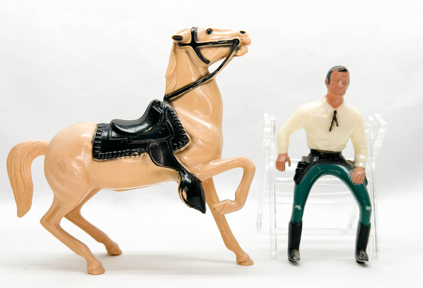 This is a nice display set, even with the mismatched cream horse, and great examples of 1960s Hartland mini sets.