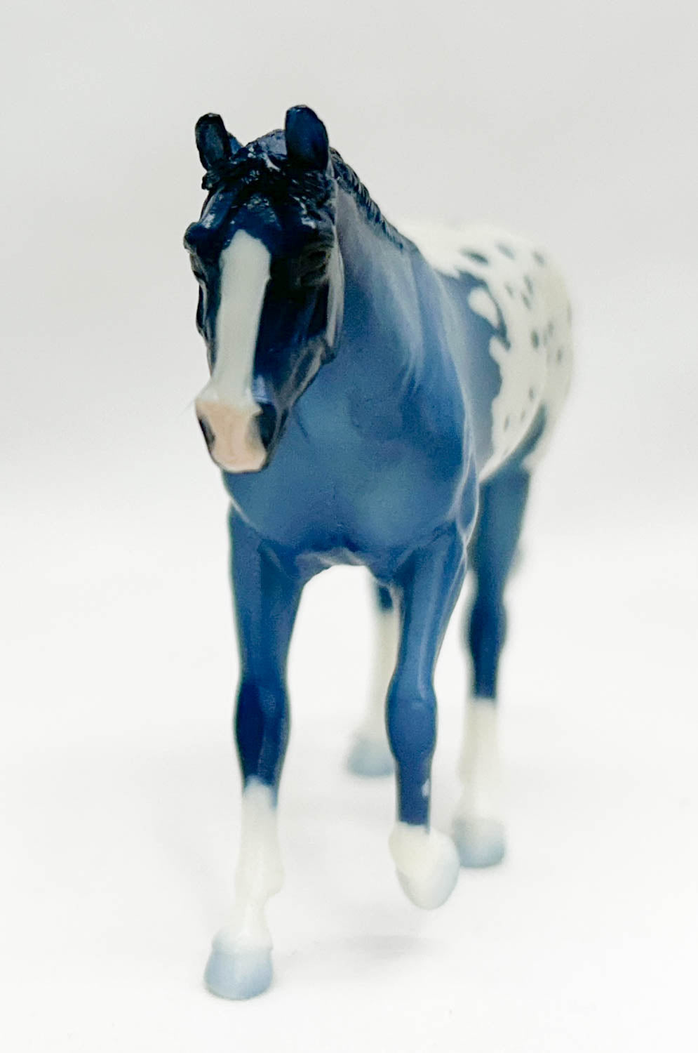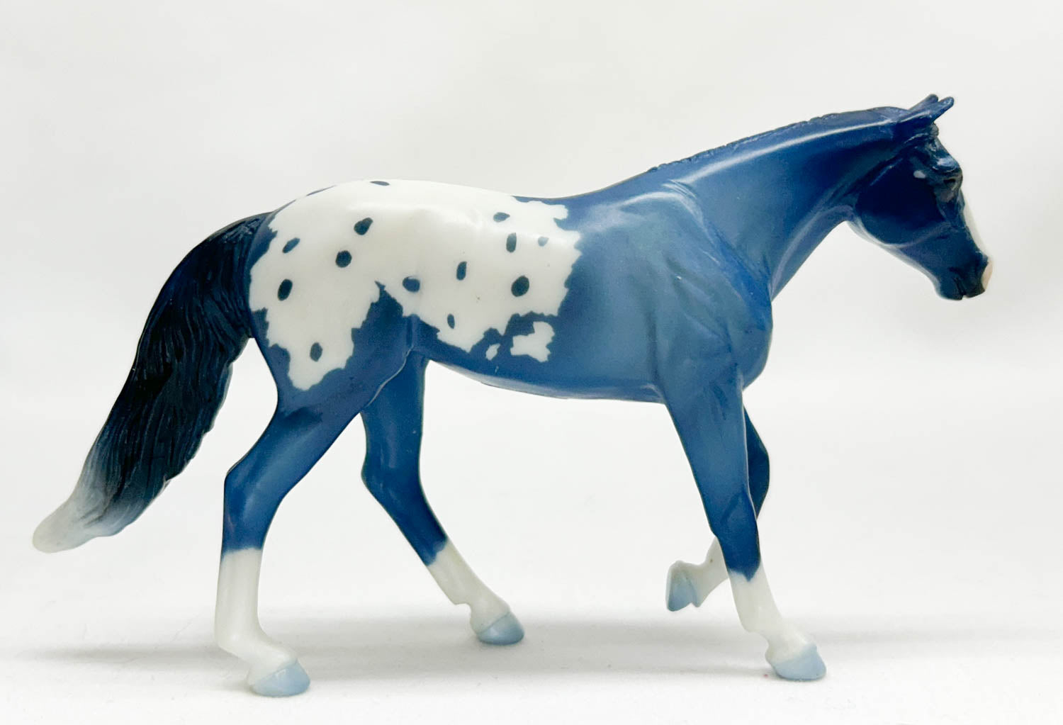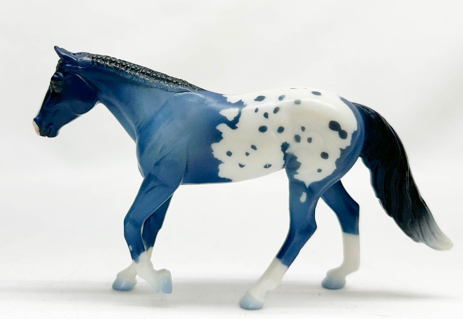 The Loping Quarter Horse's inaugural release was as this blue Appaloosa named Dungaree. She was only available to single-day ticket holders at BreyerFest 2013. Only 1250 were made.