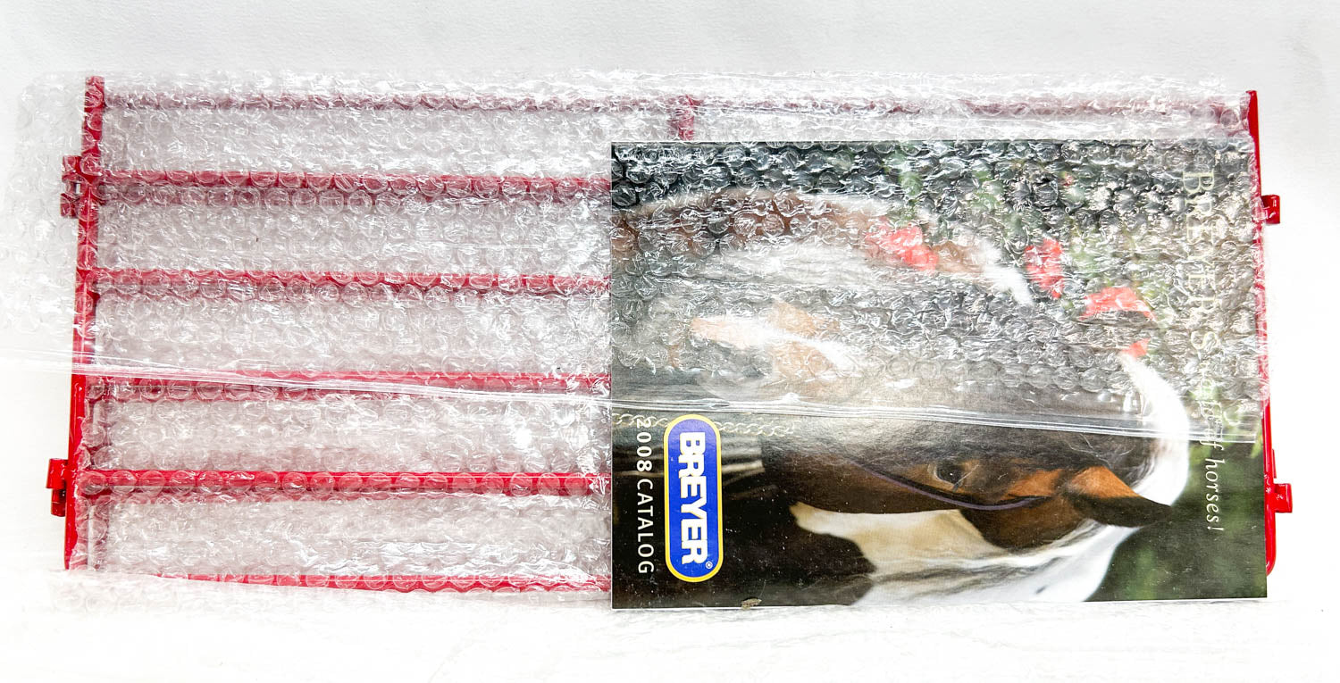 This one was never opened until we opened it to check it! We weren't sure if the tape holding the box closed was original or not, so we opened it to check, and found the four metal panels still wrapped in bubble wrap, and a 2008 box brochure included! This is a great set both for display out of box in your herd, or in box, as a lovely vintage accessory.