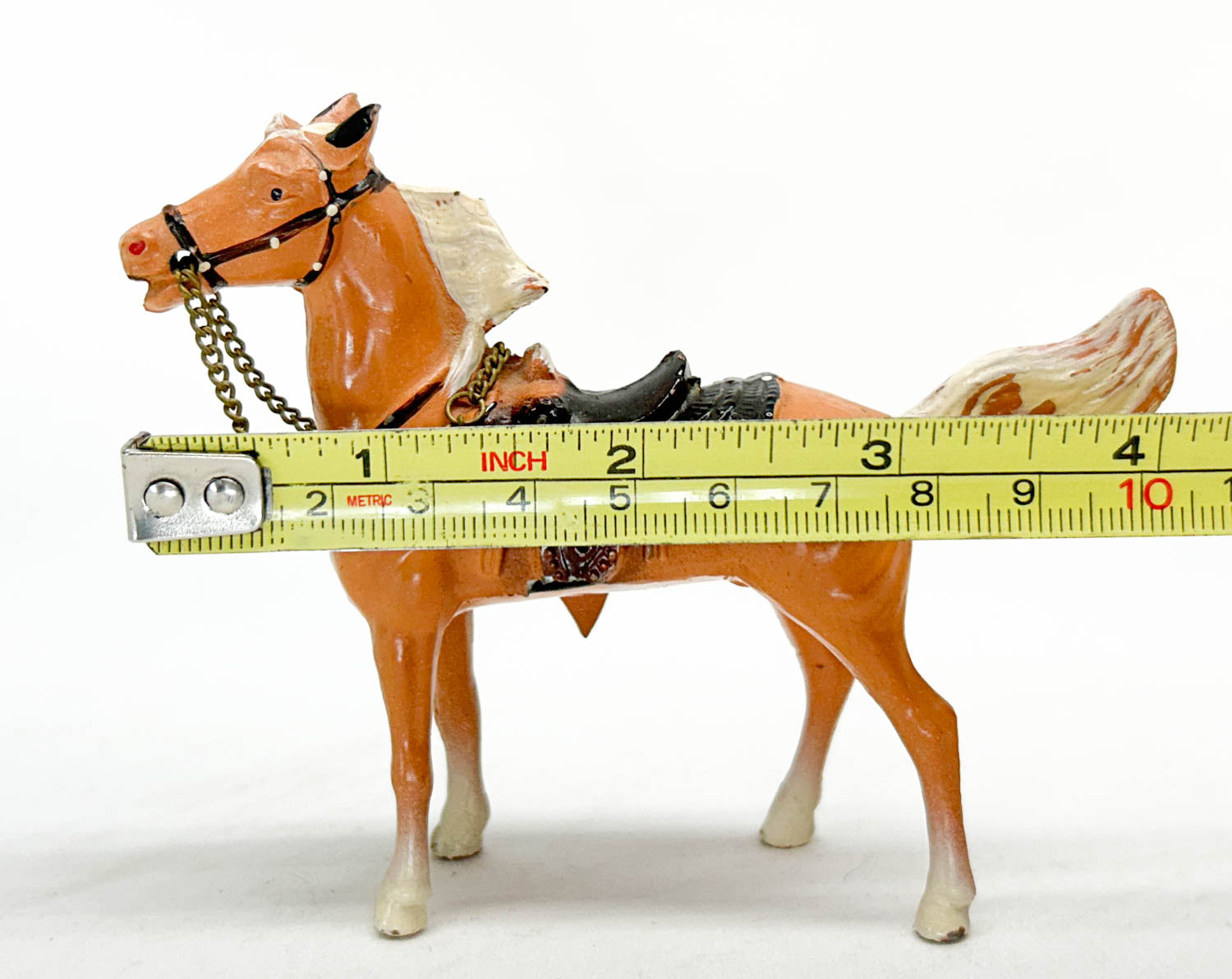 This guy is a neat vintage metal fellow with molded-on saddle and attitude.  He isn't heavy enough to be made of lead (I don't think, but just to be safe, don't let anyone chew on him), and he's probably closer to the 1970s than the 1950s.  He was made in Japan, and may have been a carnival prize.