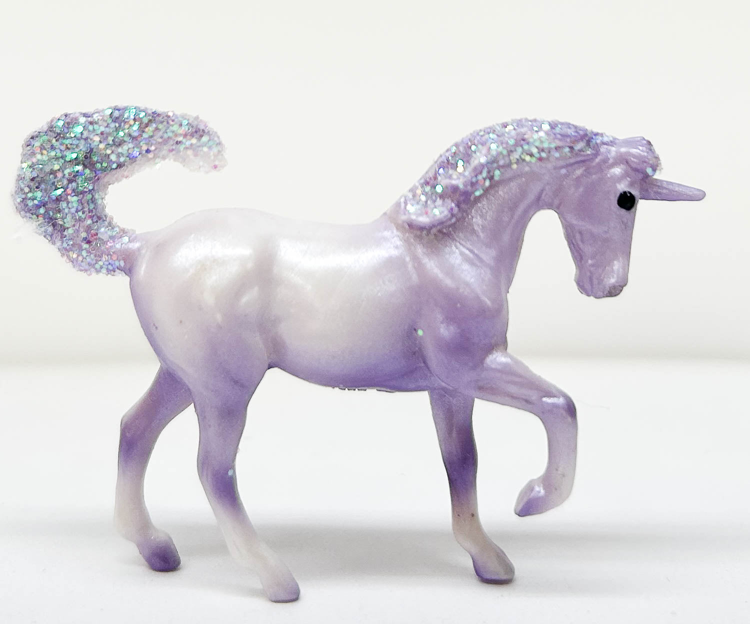 This beautiful lilac unicorn dusted with pearly white is Moonbeam. He sports a purple horn and hooves and lots of colorful glitter in his mane and tail. Moonbeam was only sold as part of a set to members of the Breyer Fairytale Friends Club in 2020.