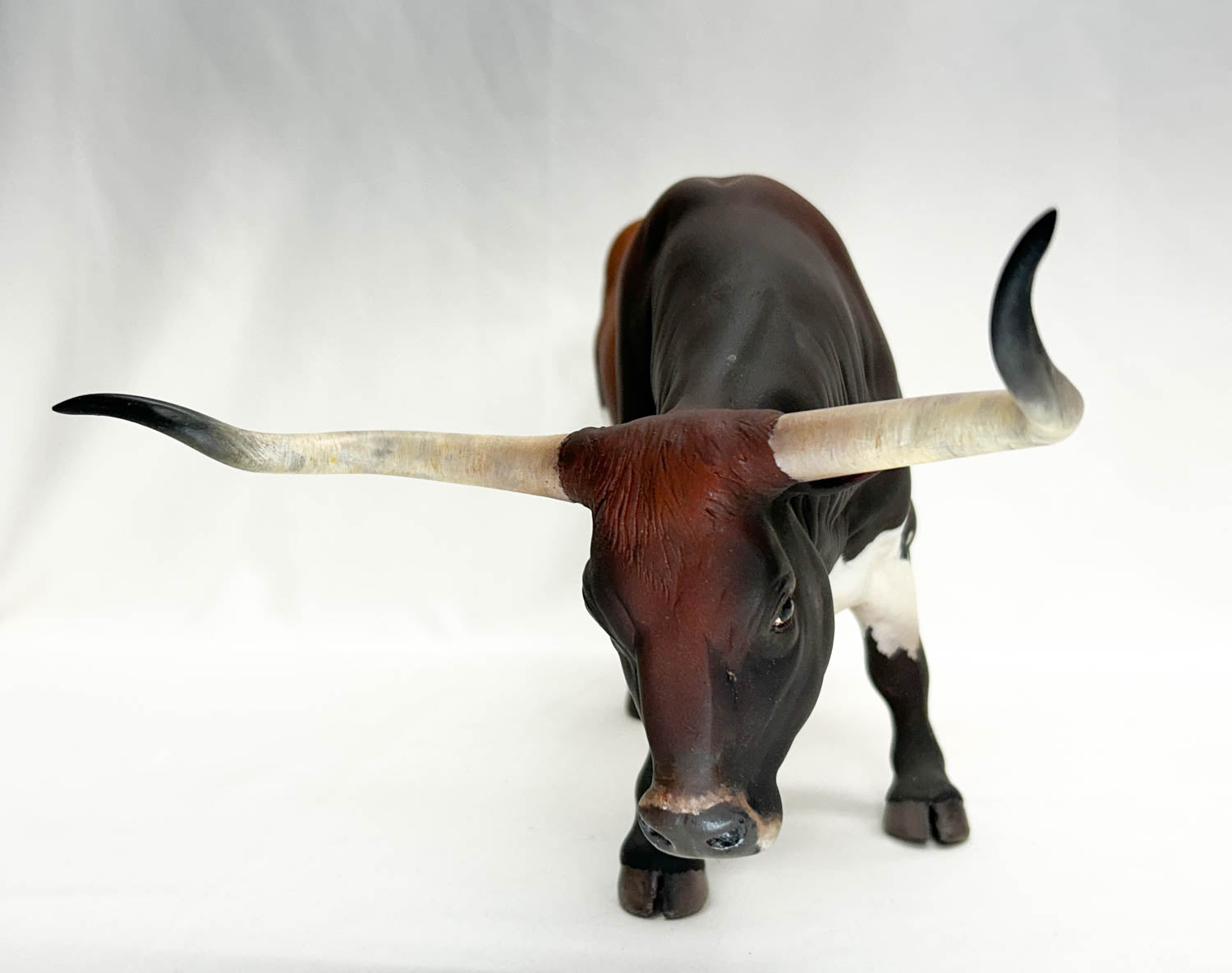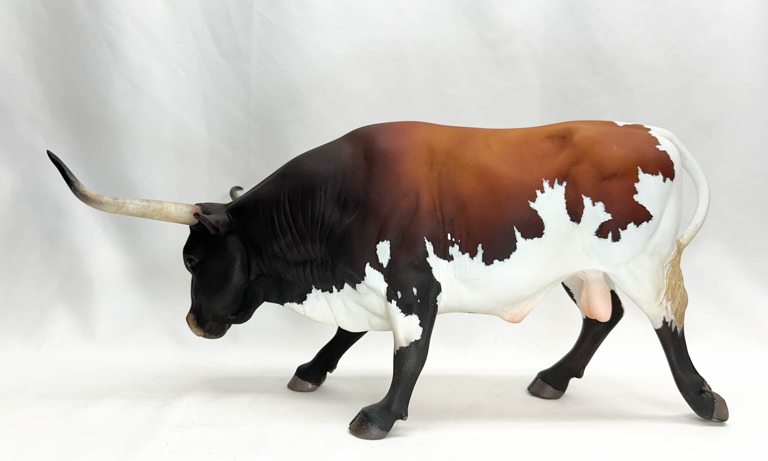 This BIG guys is a custom painted 1:6 scale Texas Longhorn bull resin sculpted AND painted by the respected artist Luis Aguilar of Nohuanda Equine Art. This magnificent fellow stands 7.5 inches high at the shoulder, with a horn-span of almost 8". This one-of-a-kind piece is ready to clean up in the show ring for you.