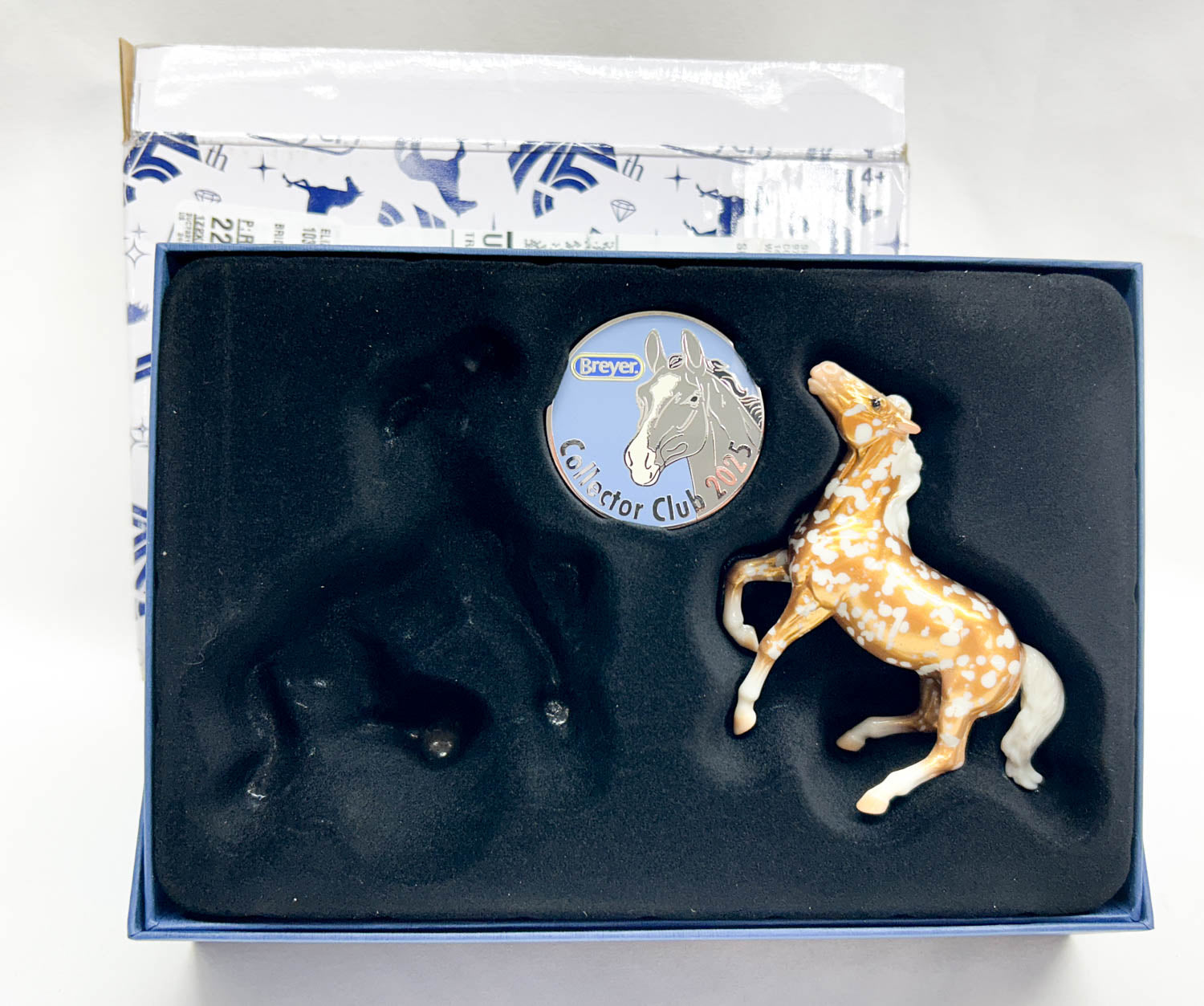 This fellow is Factory Mint with big, bold dapples! He features bright gold and soft muzzle pinking. He comes with his original box, 2025 Collectors Club pin, and even the white cardboard shipping box. His partner, Appy Darius, will be available for sale separately.