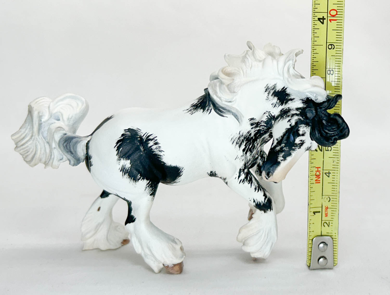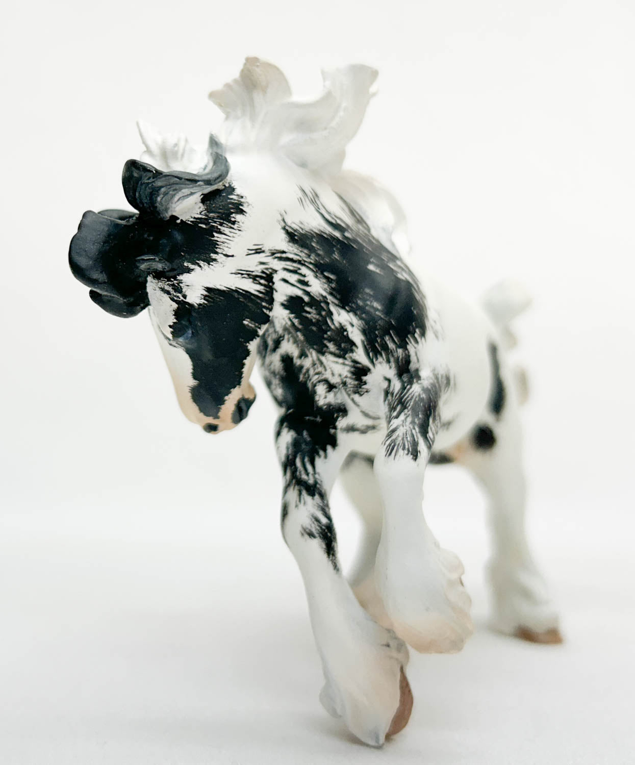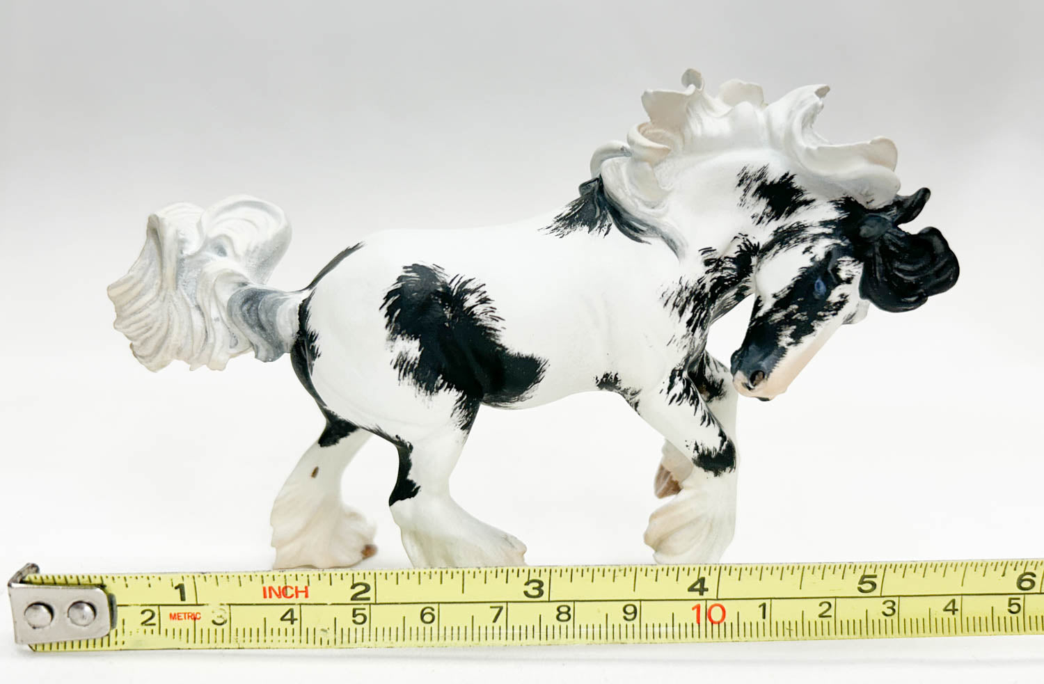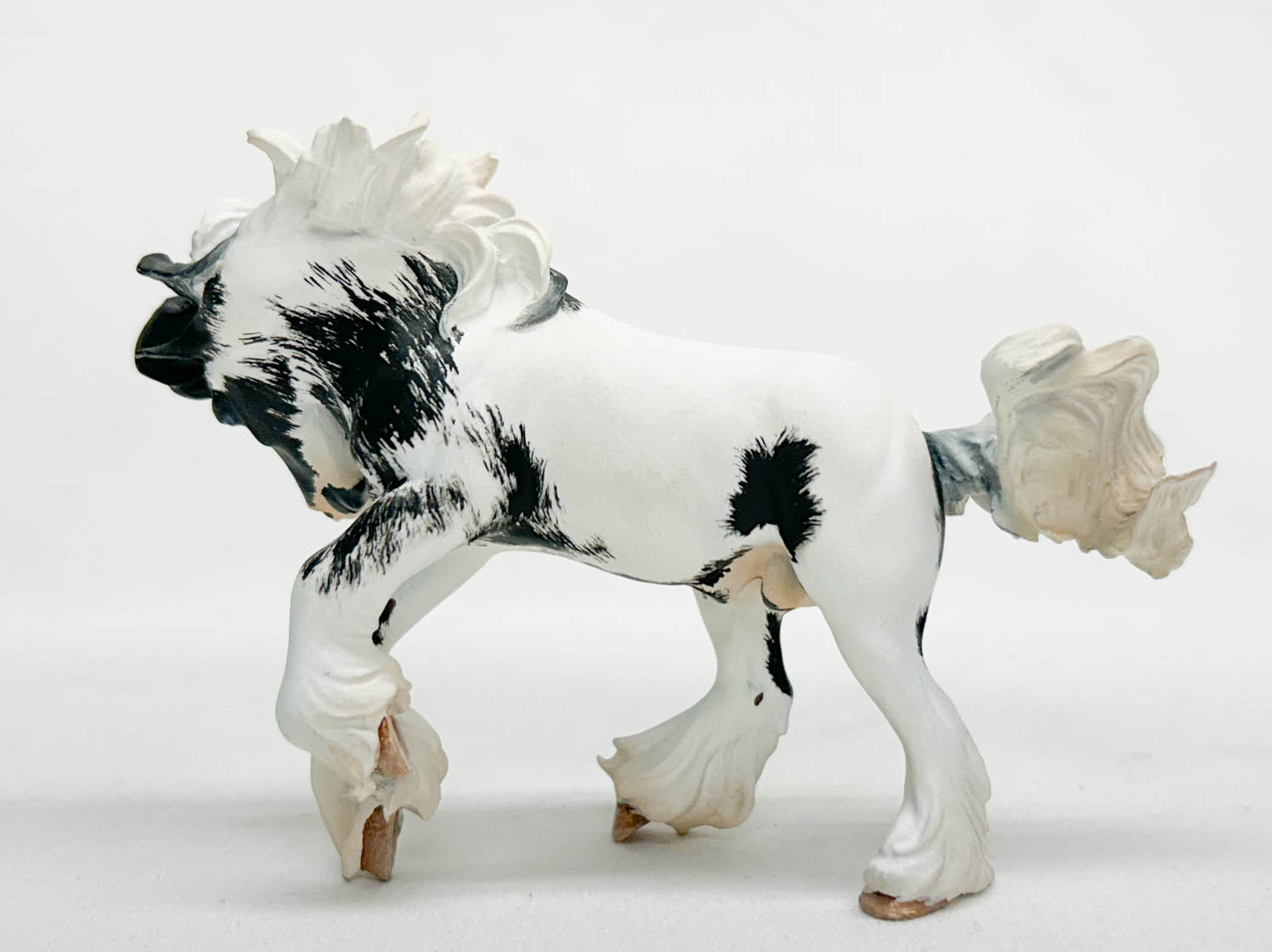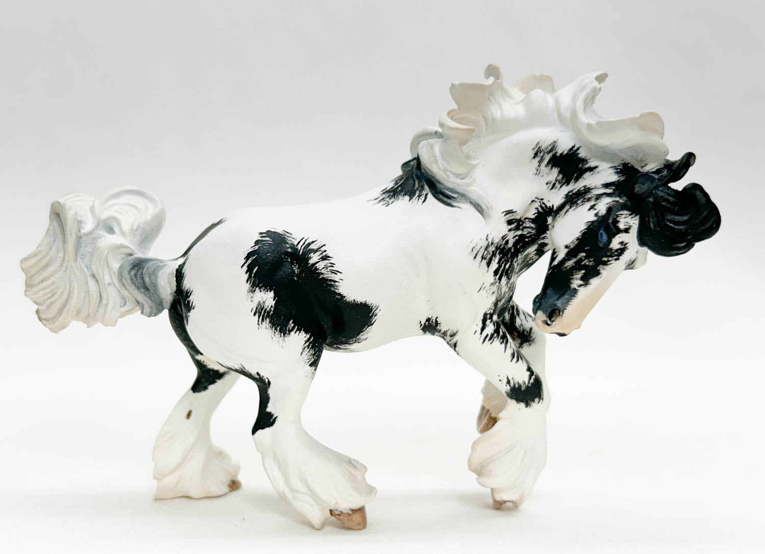 This charismatic draft stallion was both sculpted and painted by highly respected artist Sue Kern Thompson.  Called Horatio, only 51 were cast in this size in 2014, and getting one that was painted by his sculptor is even more special.  Shown in Region X as W-A-V Thunder Road, this boy features a black pinto coat with hair-edge markings, faint cream shading in his mane and tail, and blue eyes.  He is signed by Sue and dated 2016.  Sue confirmed that she painted him for Linda Dean, and he comes to us straight from Linda's collection.