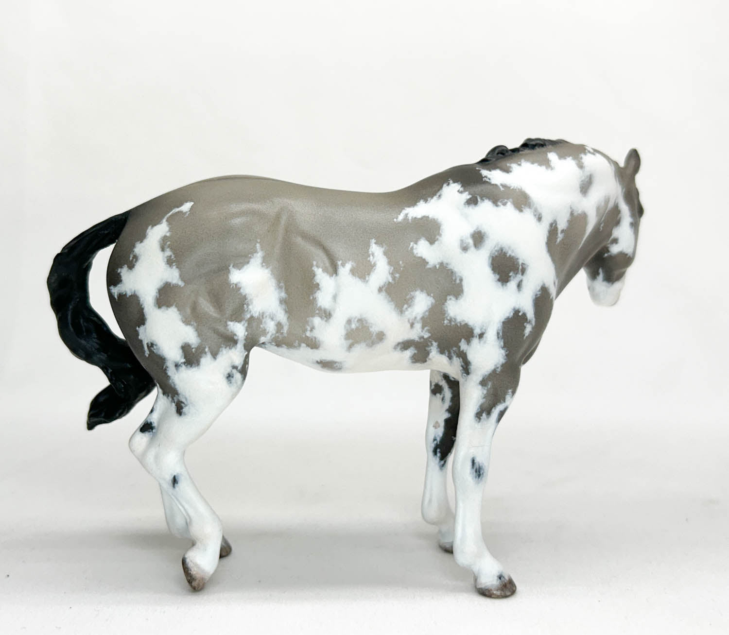 This beautiful custom resin in Curio/ Large Stablemate scale was sculpted by Michelle Platt in 2009.  This fellow was then painted by popular artist Sherry Clayton in 2010 to a gorgeous grulla pinto with a soft dorsal stripe and pretty face markings. He was formerly owned by Sarah White, who added him to the Equine Resin Directory, as an example of this sculpture.  He comes to us from the collection of Linda Dean and was shown in Region X as W-A-V Ima Big Kid.