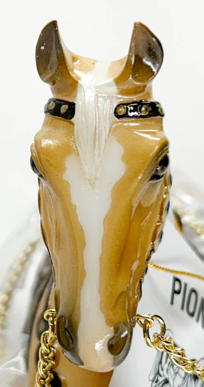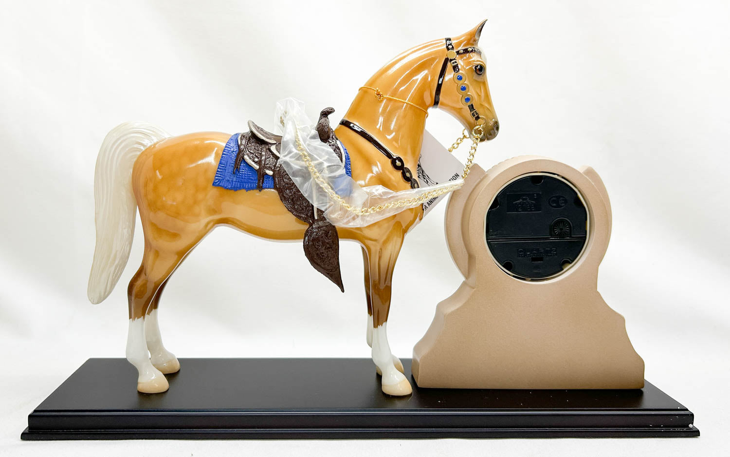 Pioneer is an aptly named girl, being the smaller version and color of one of Breyer's earliest and most iconic creations. Done on the Western Pony mold, Pioneer is a dappled palomino with pearly white mane and tail, four socks and a stripe. Her molded-on bridle matches her dark brown, gold, and blue saddle. She is attached to the clock base. The clock is a solid, heavy, battery-operated unit that features a bas relief of the Mustang Stallion (Fireheart), Cantering Mustang Mare and Rearing Mustang Foal. The underside of the base is covered in velvet to protect furniture. She was only available to 2025 Vintage Club members.