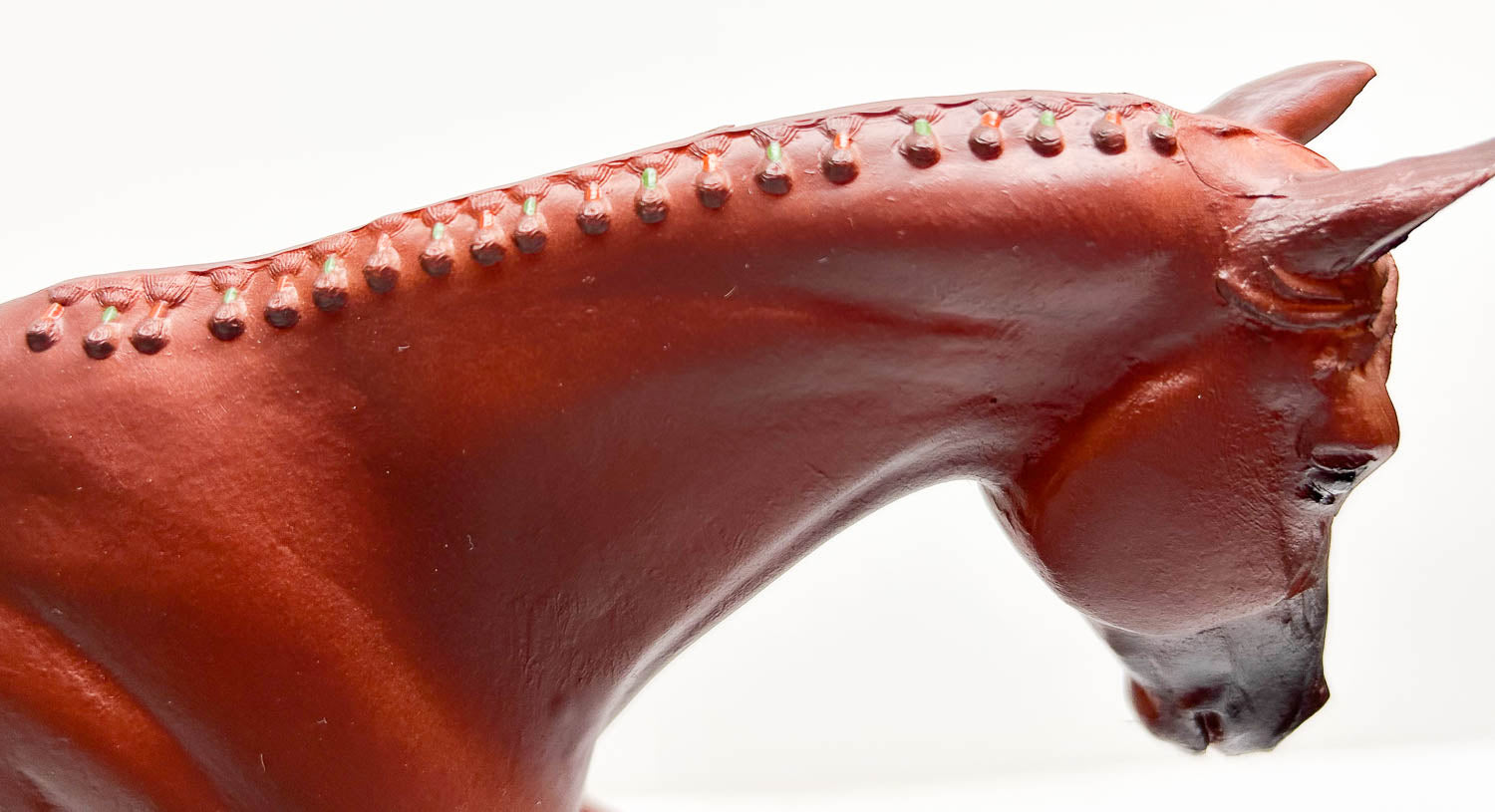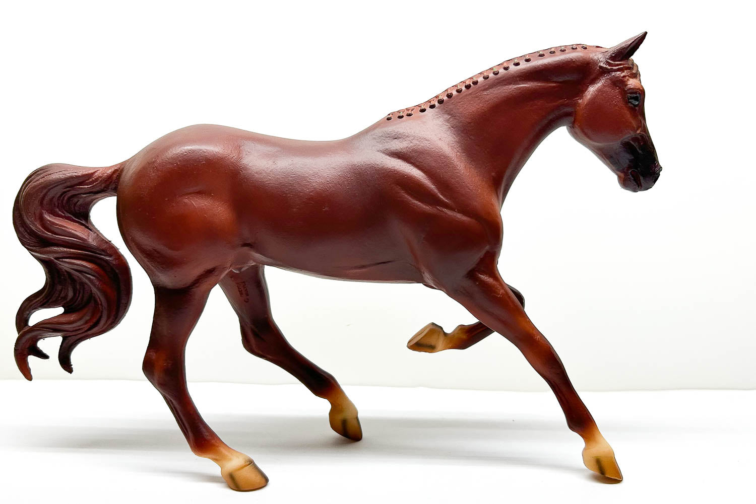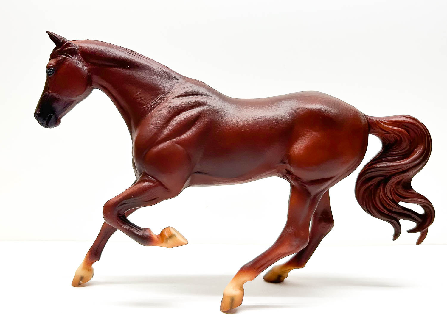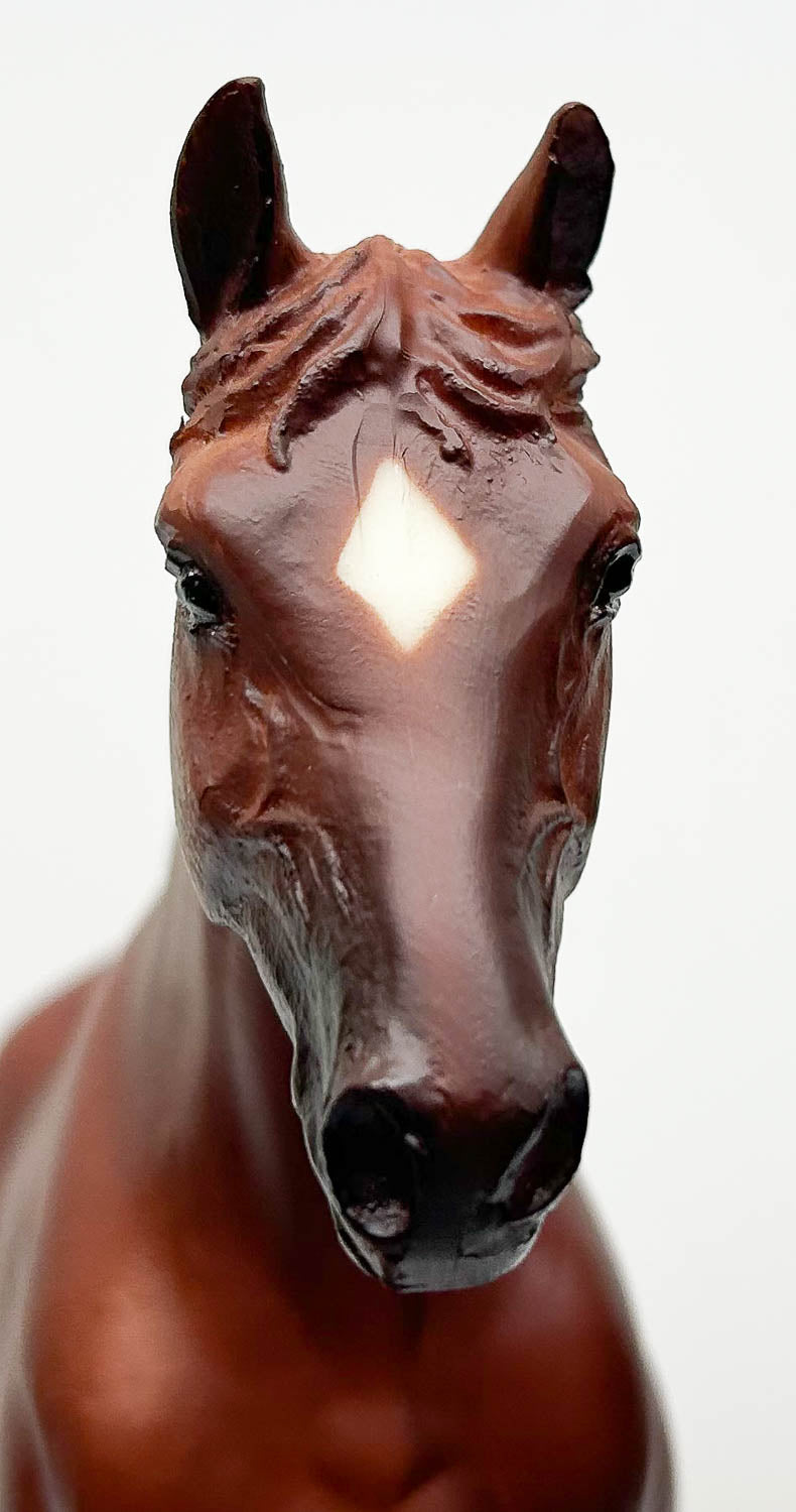This fellow is Near Mint with only tiny hoof rubs on his left front and right hind hooves. His socks look yellowed, but I believe they are just over-sprayed, as his star is bright white. He features striped hooves and well-blended muzzle shading. He stands well, but this mold is known for rearing up and flipping backward, so we recommend Museum Putty or a Horse Safety Rack to keep him safely upright.