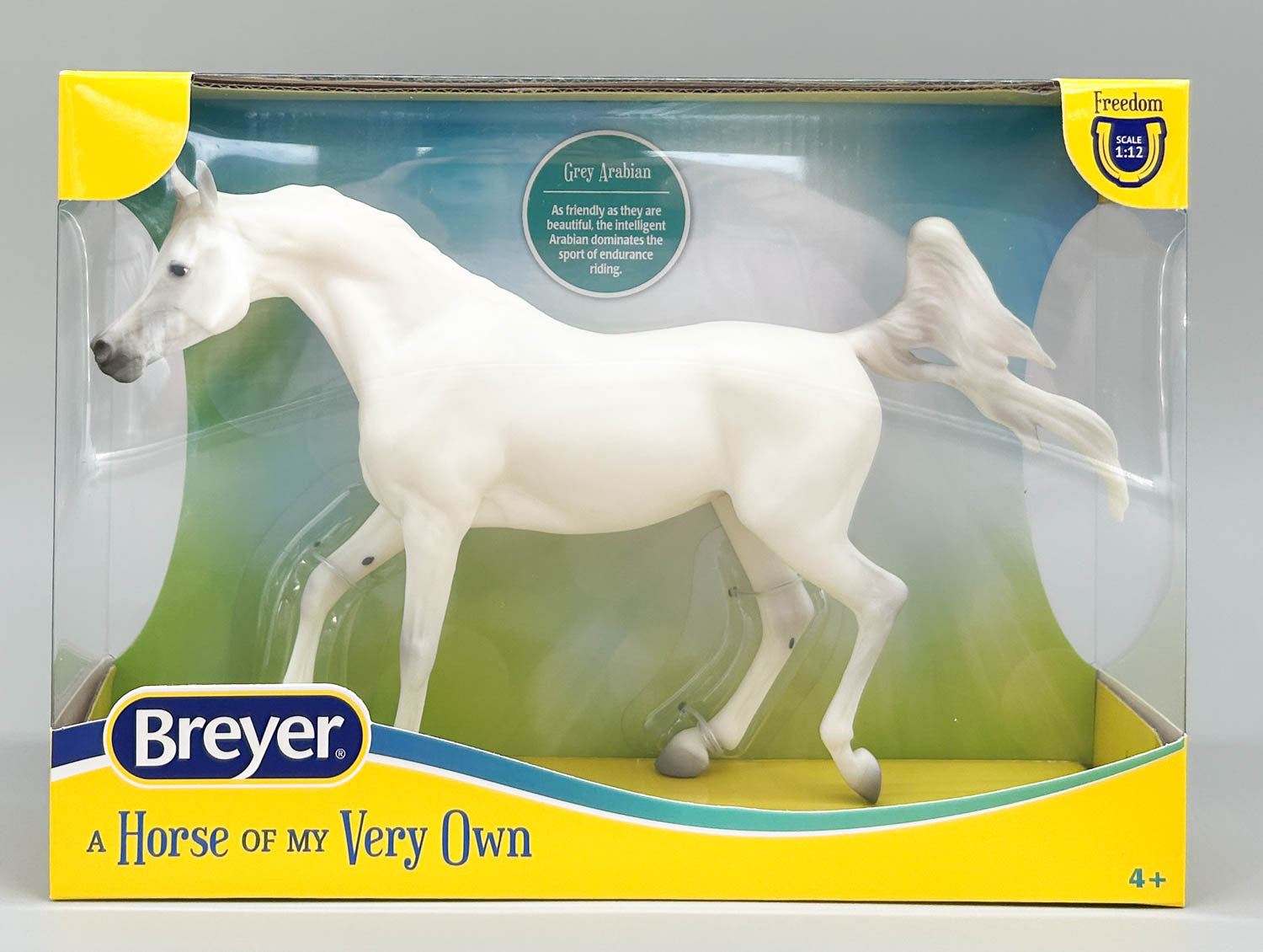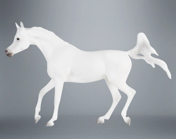 This pretty grey Arabian mare is so white that we had to darken the background just to see her! She is accented with grey shading and is sure to be a hit. She joined the Breyer line in 2026.