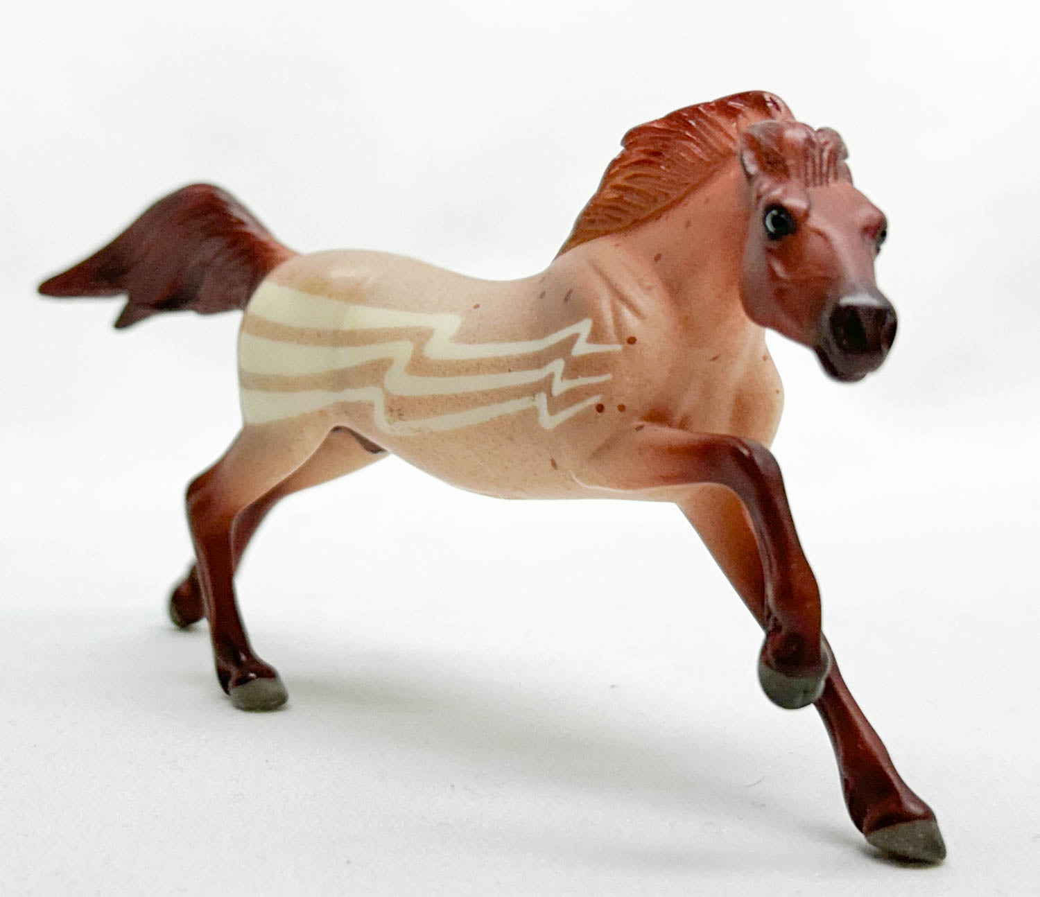 Stripes is Near Mint with just very slight age yellowing.  He features neatly masked stripes with tiny roan speckling, body shading and larger speckles on his forequarters.