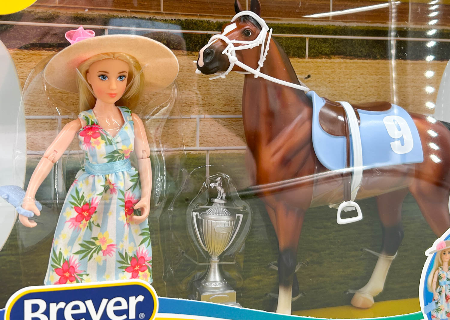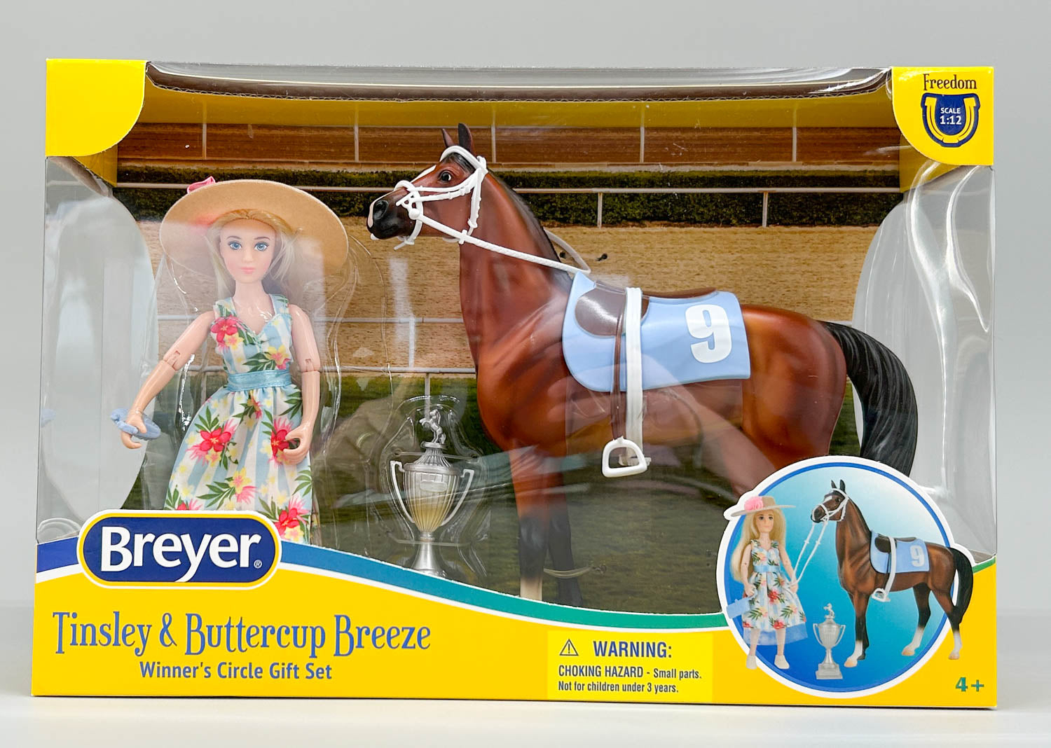 Tinsley's heart raced for Buttercup Breeze, her speedy and spirited Thoroughbred.  A winner on the track and a sweetheart at home, Buttercup was always a star in Tinsley's eyes.  Whether chasing trophies or trotting through fields, their bond was the true prize.  Set includes Buttercup, Tinsley, sun hat, purse, racing saddle, bridle, and trophy. joined the Breyer line in 2026.