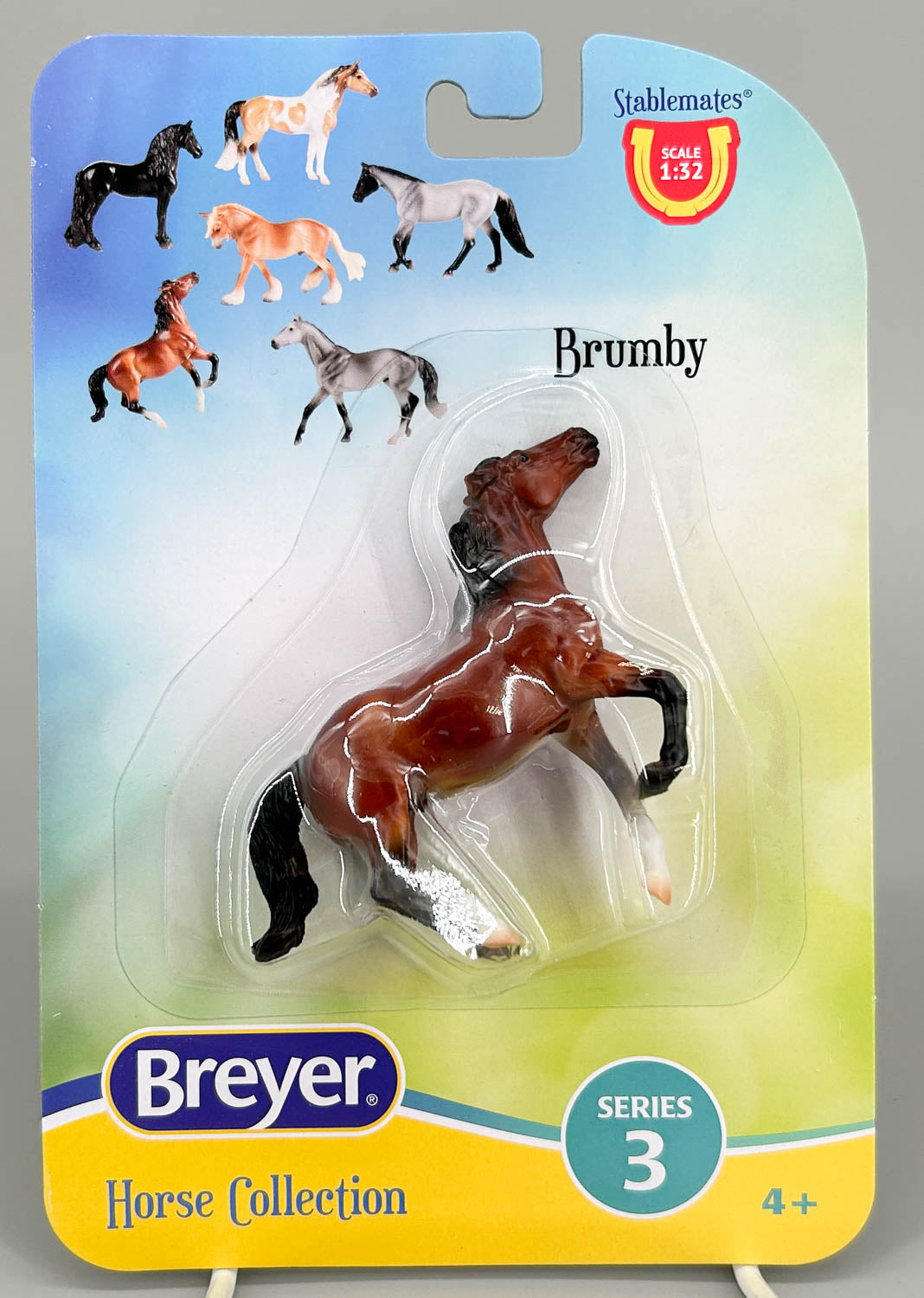 This first Regular Run release on the Stablemate-scale Semi-Rearing Mustang doesn't disappoint! He wears a bright bay coat with diagonal socks. He joined the Breyer line in January, 2026, packaged in a bubble card.