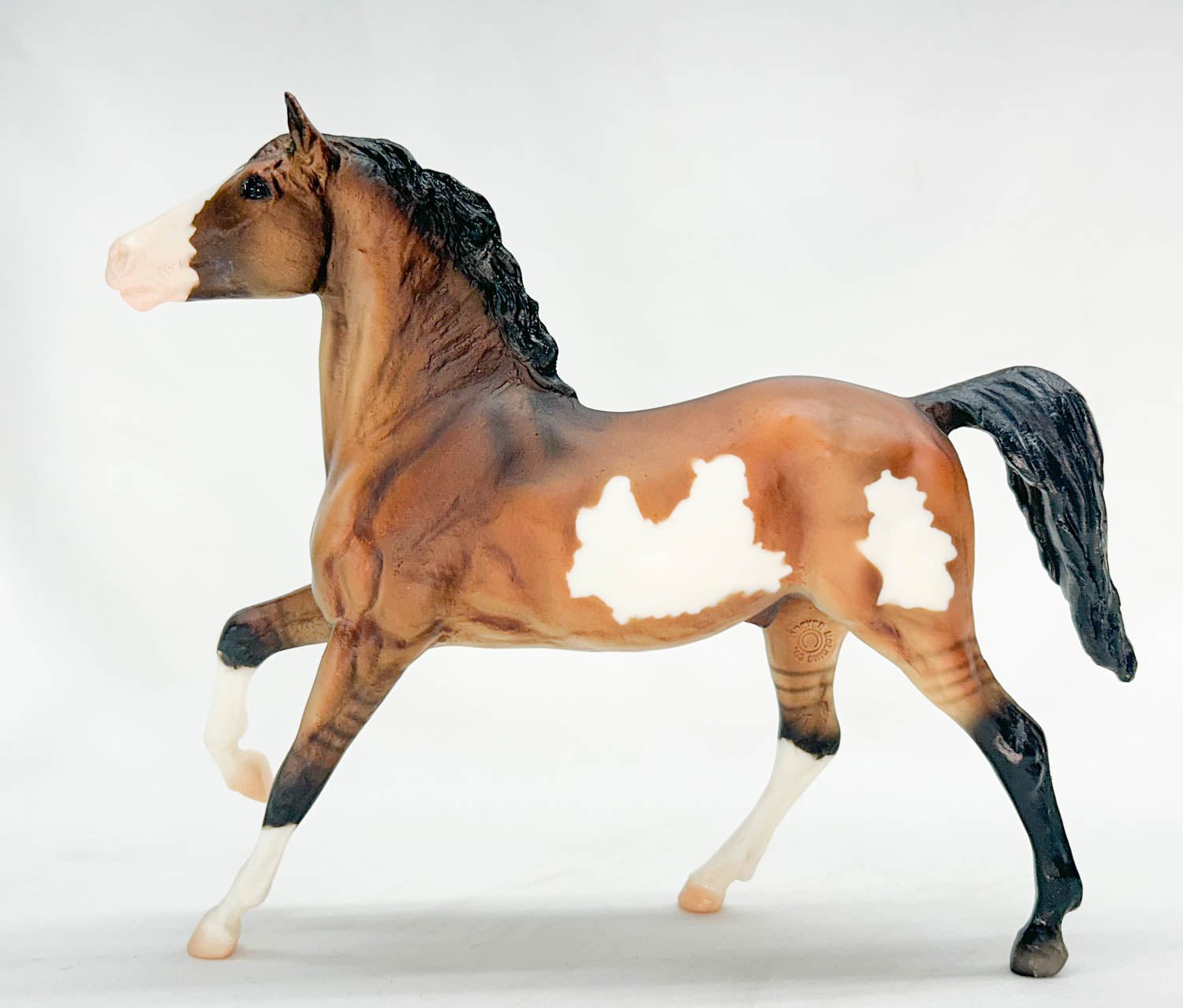 Aguila is a lovely dun pinto on the Black Beauty mold. He wears a dorsal stripe and leg barring, along with his pinto markings, three stockings and an apron blaze. He was a single year release only available through Walmart in 2006.