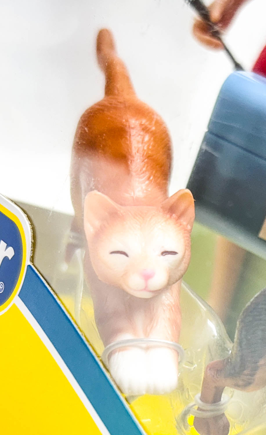 The Warmblood Foal is done in rich buckskin with a blaze and one hind sock. He comes with a cheerful blanket that matches the vet's jacket. Set includes foal, blanket, vet, vet bag, stethoscope, bucket, and two friends: a black and tan Jack Russell Terrier and a ginger striped stretching kitty.