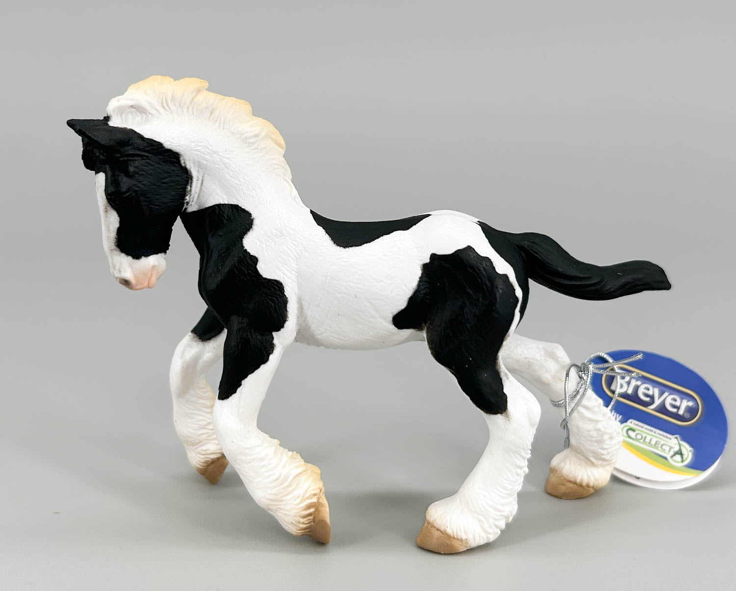 The Gypsy Vanner / Tinker breed, popular for their wild colors, full manes and tails, and feathered legs, are growing in number every year.  This foal is a testament to why:  Even at this age, he shows the spirit, energy, and coloring that will make him a champion.  This little guy is a black pinto with well-masked coloring, a blaze, and muzzle pinking.  He joined the CollectA line in 2016.