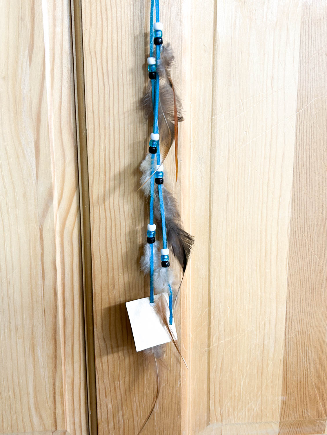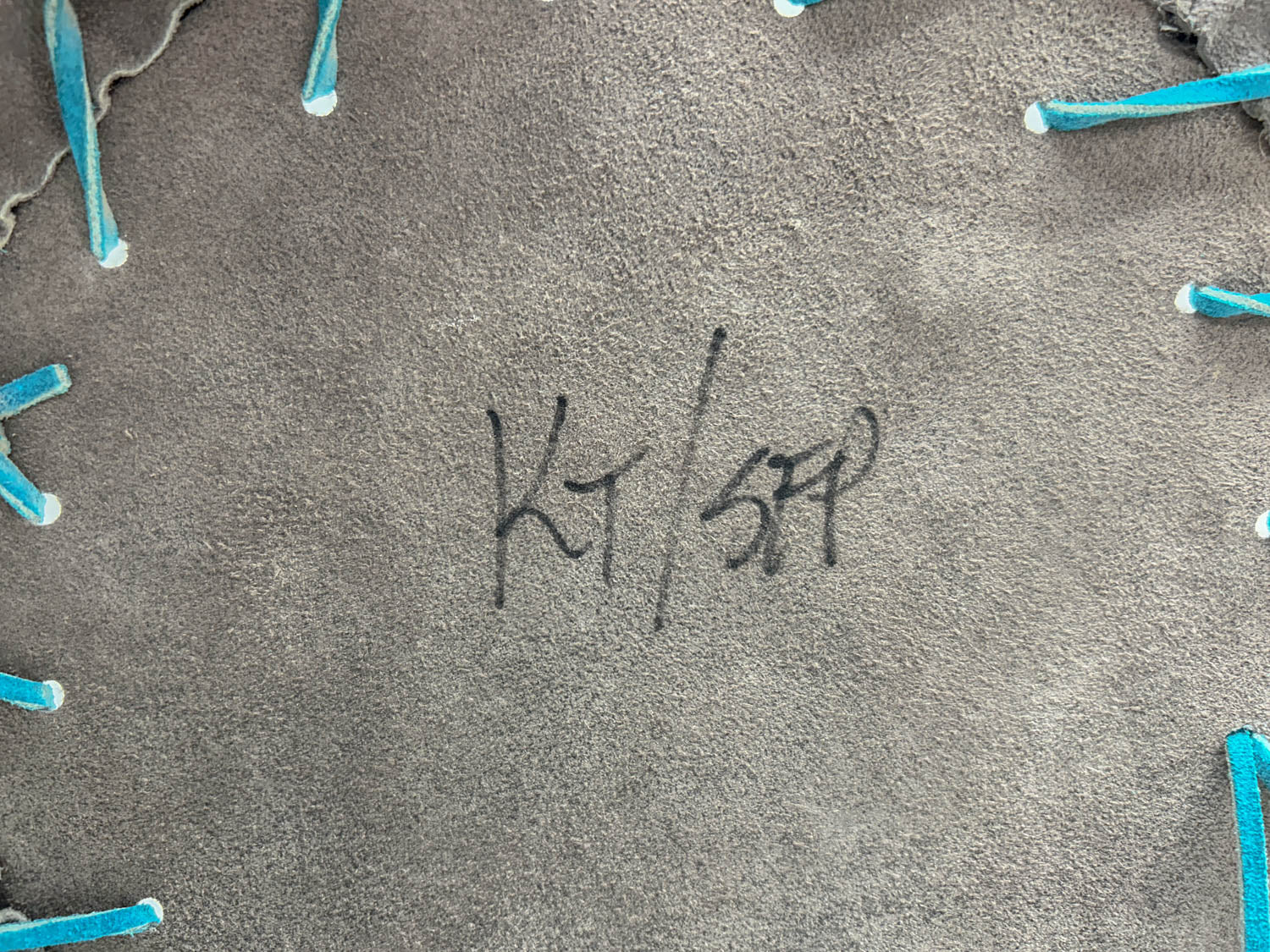 This is a beautiful piece of handcrafted, signed art from the Southwestern USA. This leather shield, or dreamcatcher, is made of suede strung over a 9" hoop, and hand-painted with a stylized version of "The End of the Trail" image, in turquoise and terra cotta colors. Attached to the front are a stone arrowhead and a shard of ancient pottery - A connection from present day to the ancestors.