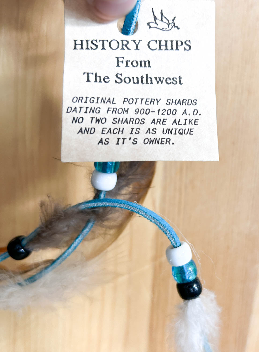 Hanging from a concho are two beaded and feathered tassels, and when hung, the entire piece is approximately 30" long. A paper tag states that they use "original pottery shards dating from 900-1200 A.D. No two shards are alike." The shield is signed on the back "KT/SFP." I don't know its original origins, but it was given to me (Eleda) as a gift by a friend in the early 1990s. It has hung here ever since, and now it is ready to bring awe to someone else.