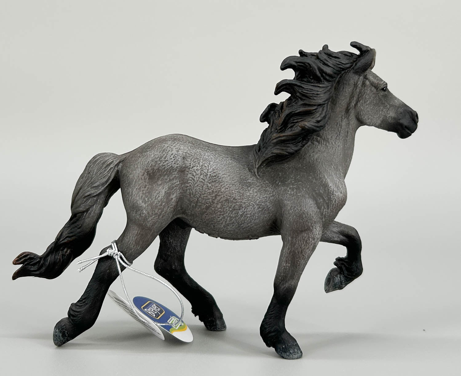 Moving along at their signature tölt gait, this beautiful blue dun (grulla) Icelandic is cute as can be! He sports a word-bubble shaped star, pink snip and a hint of warm shading in his mane and tail, along with the hair-coat texturing that CollectAs are known for, which looks perfect on this fuzzy breed! He joined the CollectA line in 2018.