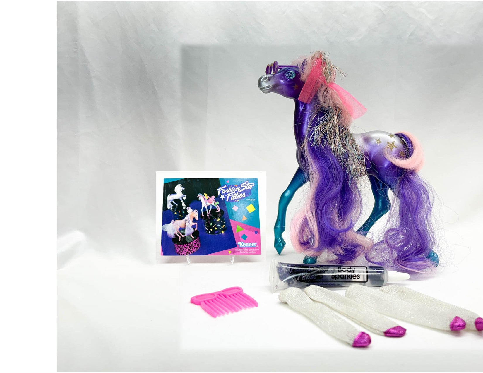 Kenner jumped into the horse seen in the late 1980s with their Fashion Star Fillies line. The SongStar Sixteens series included "teen" horses styled for different music types. These horses, sized in between Classic and Traditional scale, wore shimmering coats in fantasy colors, had manes and tails ready to be styled, and came with fun fashion accessories. Janis is a rock star filly with a purple coat highlighted in silver, with rich blue legs and glittery gold star beauty marks. She has a pink and purple mane and tail with tinsel accents. She came with perfect '80s rock star accessories, including glittery silver leggings, purple sunglasses, a hot pink hair brush and purple body glitter. She is so rare with her accessories that even the reference site didn't have photos of everything together!