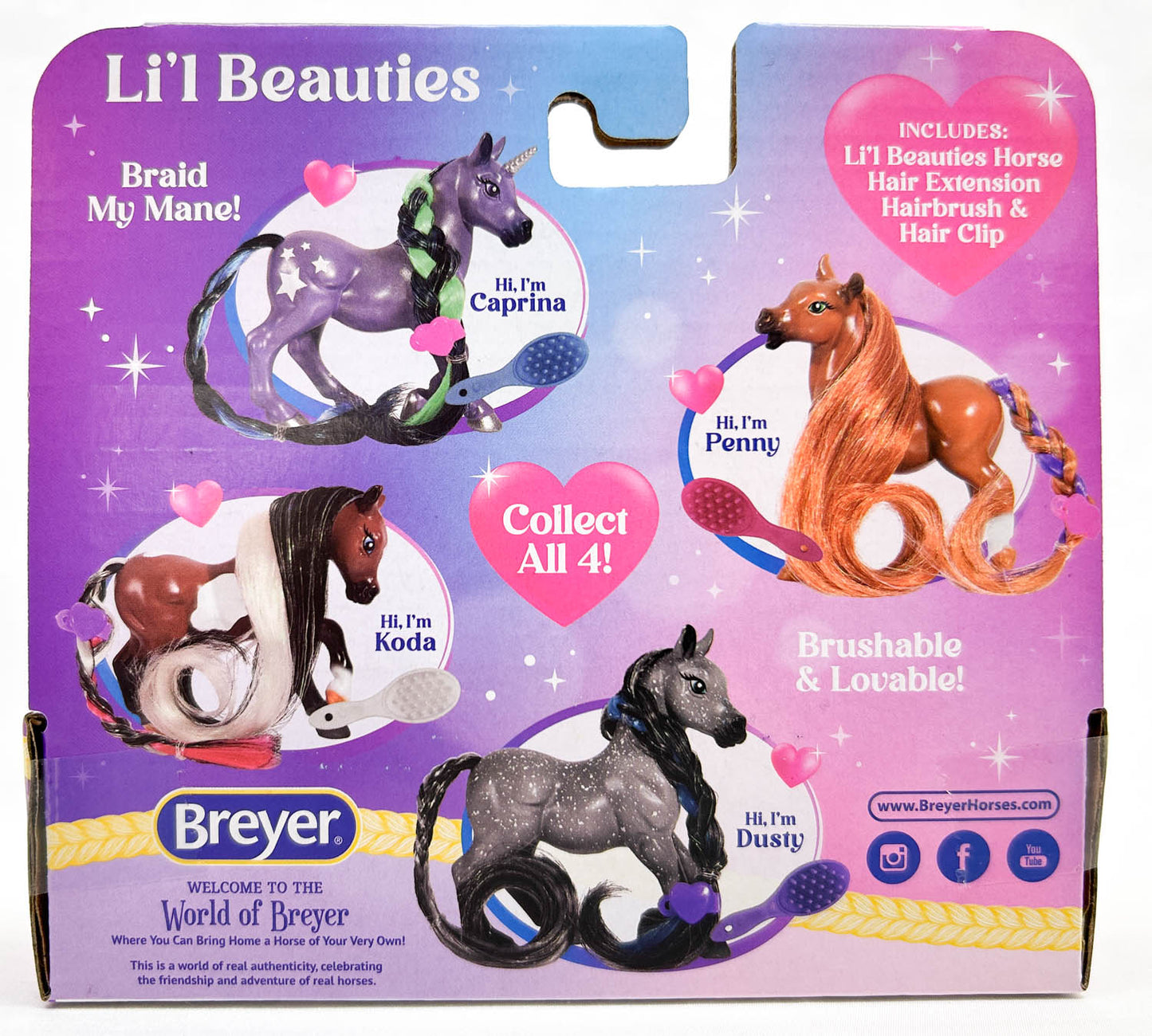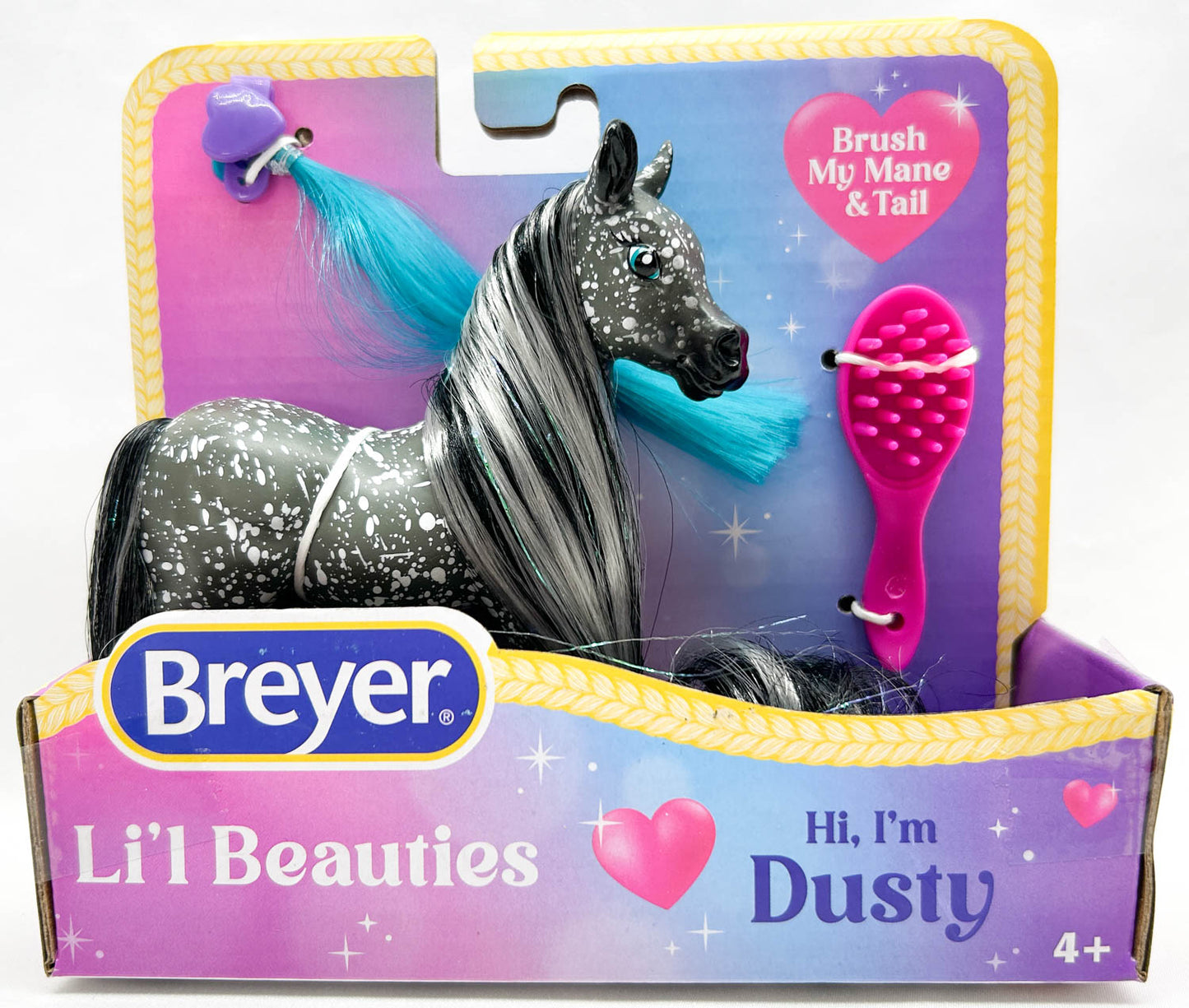 The Li'l Beauties line is both fun and collectible, with brushable mane and tail and great accessories! Dusty is a dapple grey with a shiny grey and black, brushable mane and tail. She comes with her own hair brush and a barrette with a teal hair extension. She joined the Breyer line in 2025.