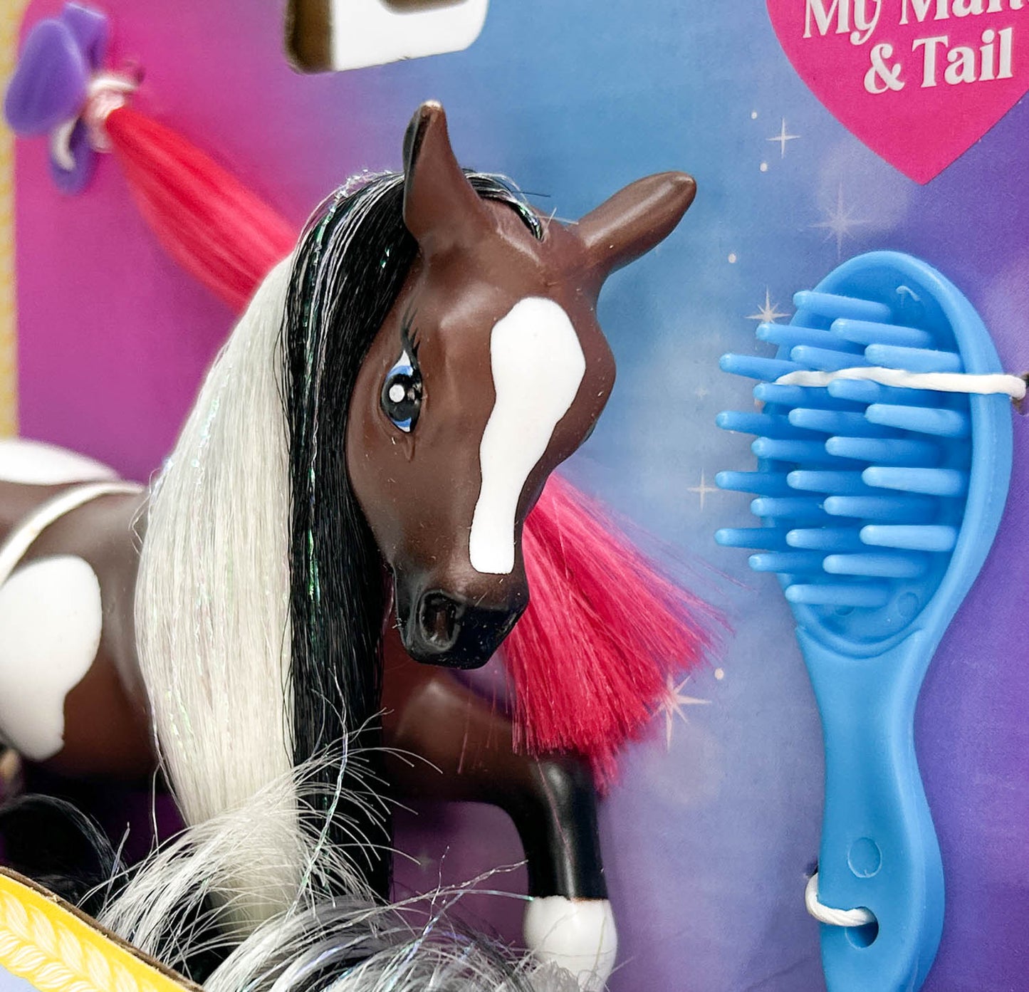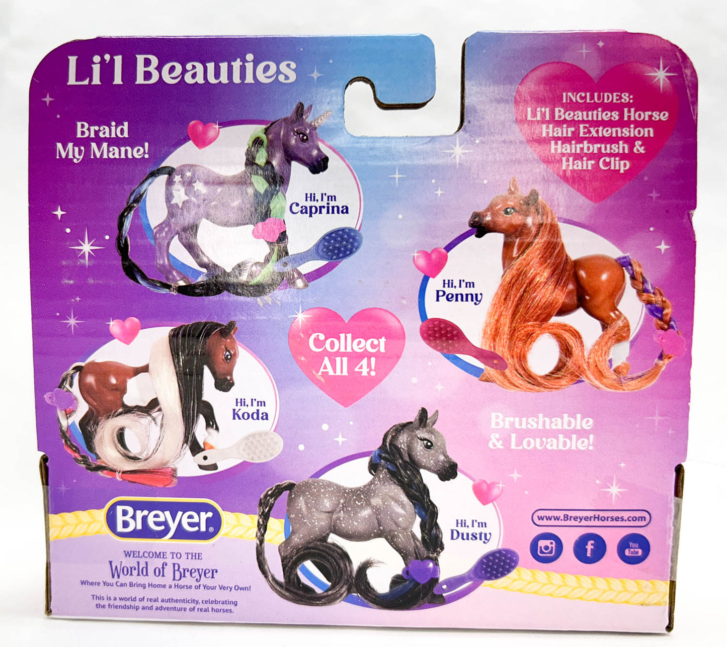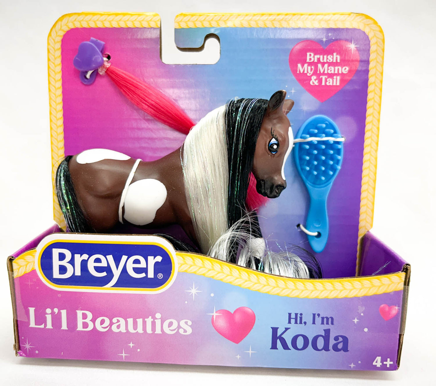 The Li'l Beauties line is both fun and collectible, with brushable mane and tail and great accessories! Koda is a bay pinto with a black and white, brushable mane and tail with a hint of glittery green accents. She comes with her own hair brush and a barrette with a red hair extension. She joined the Breyer line in 2025.