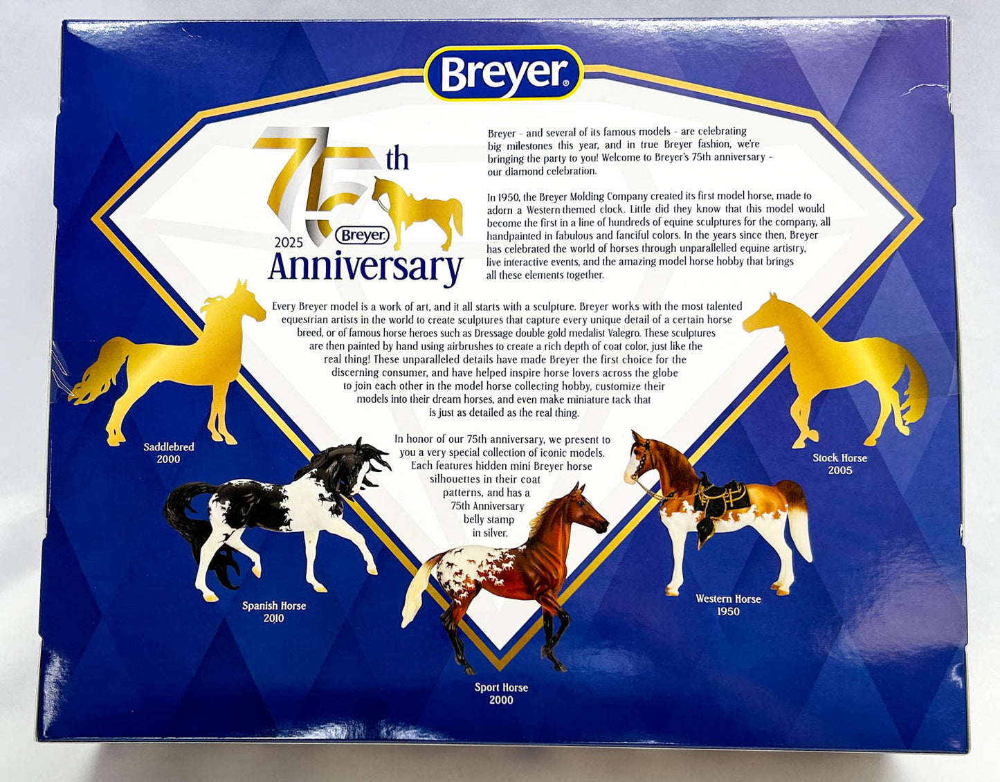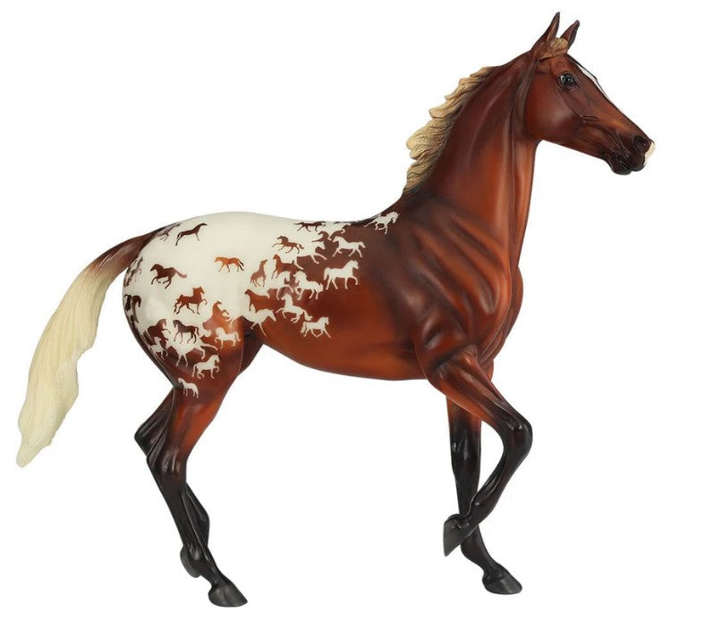 Lonesome Glory dons a rich flaxen chestnut Appaloosa coat with a narrow stripe, as part of the 75th Anniversary series. But wait, look closer.... His blanket pattern is made up of Breyer silhouettes! How many can you identify?