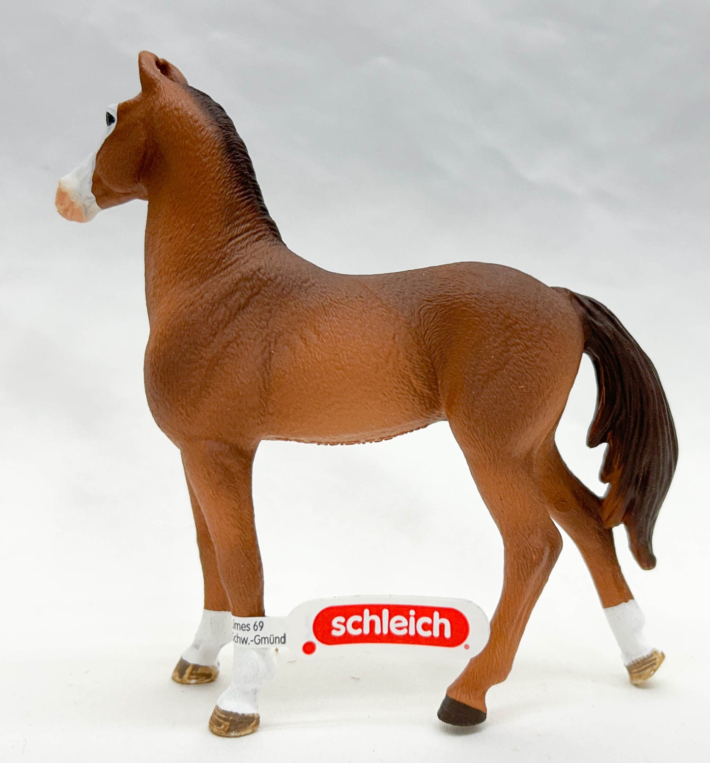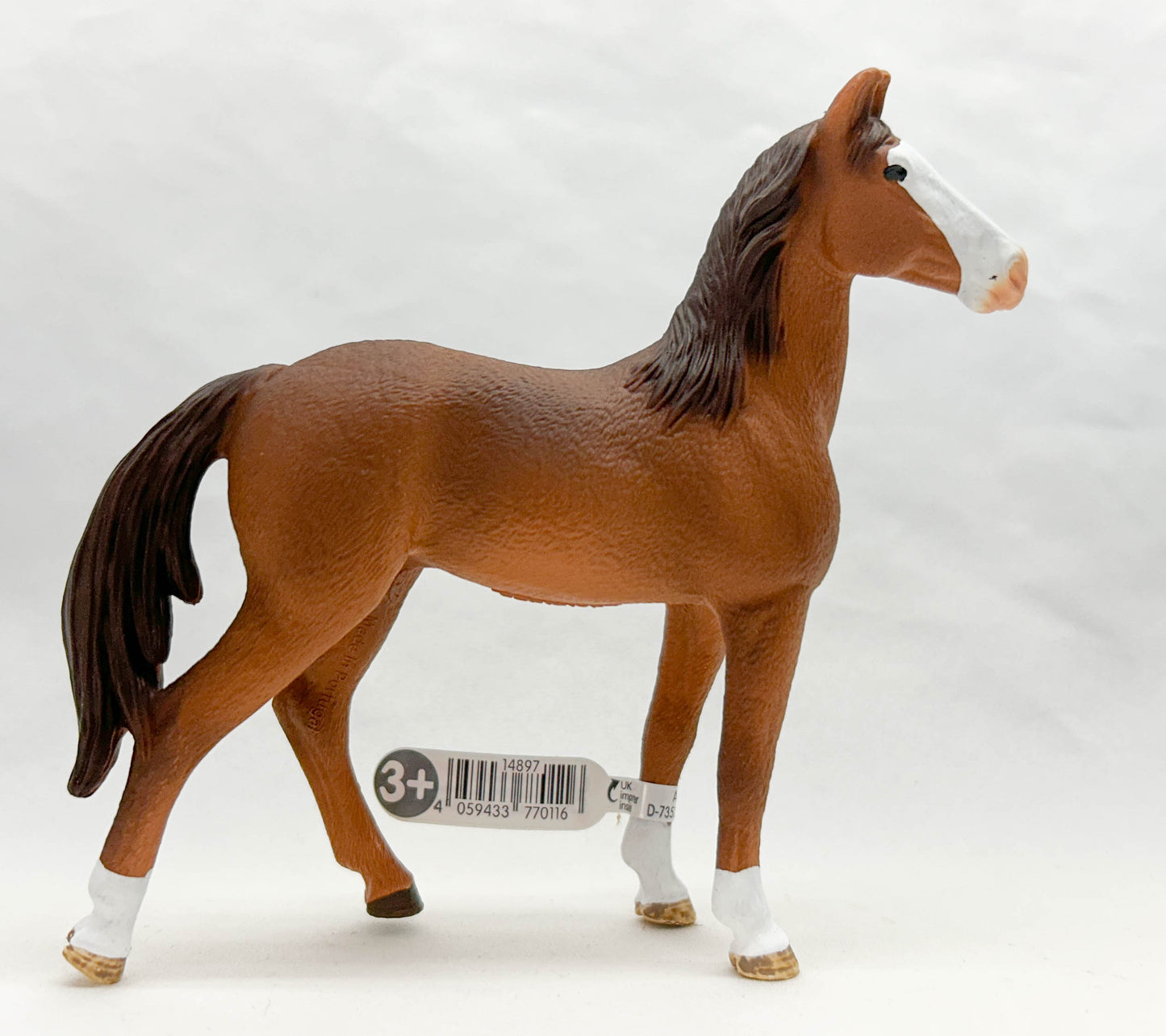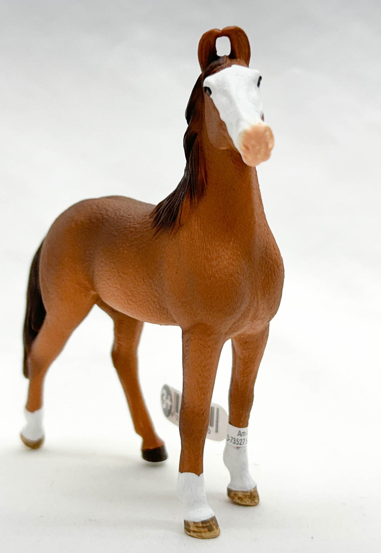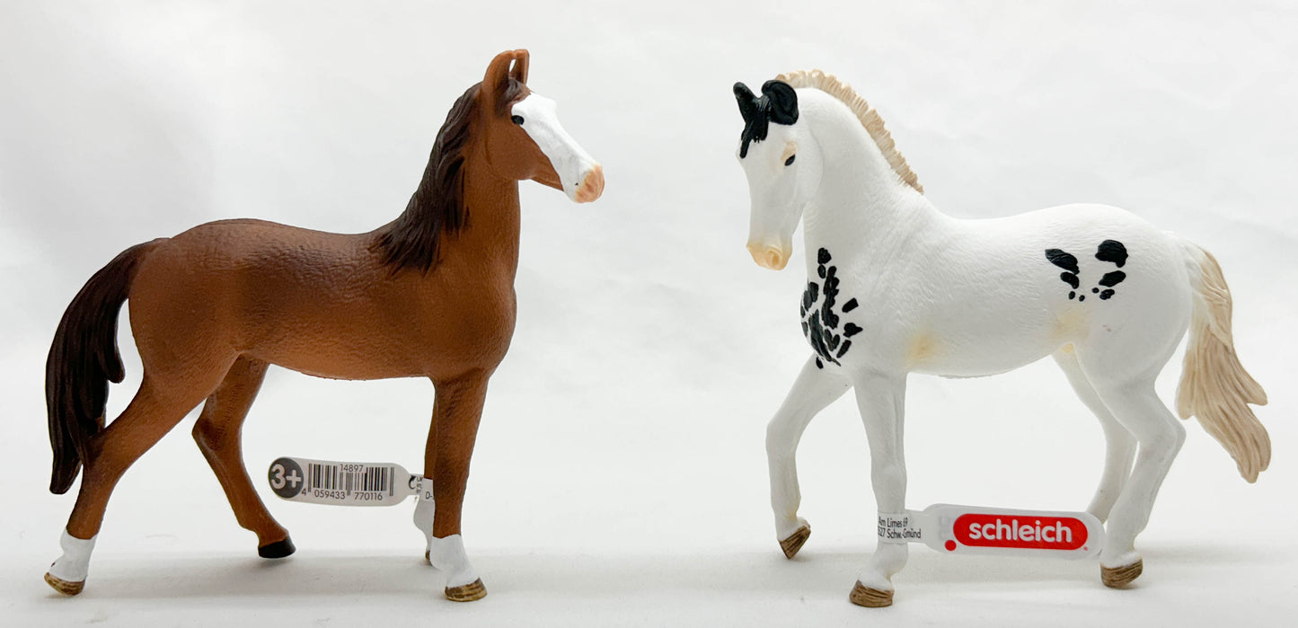 This beautiful mare represents her breed well. Originating in India, Marwaris were the horses of royalty, bred to be highly refined, with upright, proudly held heads and ears that curve inward at the tips. She wears a chestnut coat with three socks and a bald face. She joined the Schleich line in January, 2025.