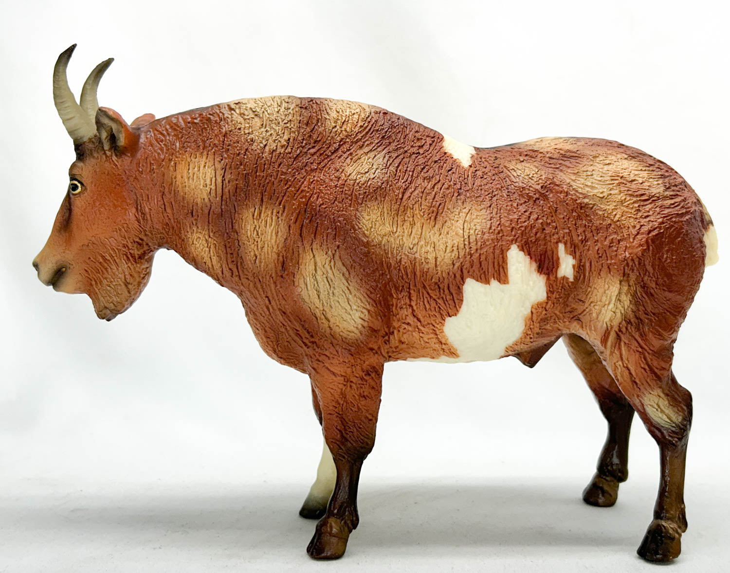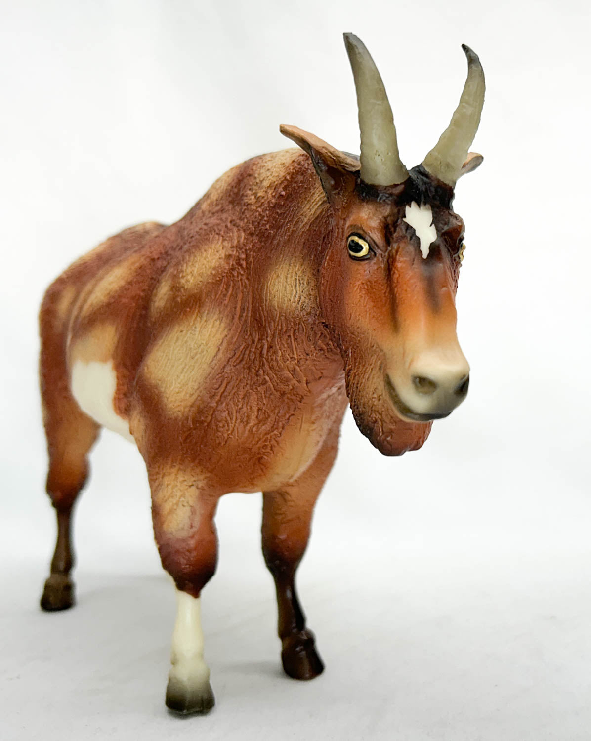 Gruff is a mottled piebald mountain goat with masked white markings. He was appropriately the animal Special Run for BreyerFest 2011, whose theme was "FairyTails." This billy goat Gruff wears one sock and a little star, along with gold eyes that have seen things... Probably trolls.. He's a very hard fellow to find these days, since only 400 were made, and most have disappeared into collections years ago.