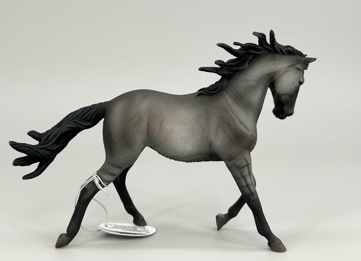 This gorgeous Mustang Mare trots at liberty with lovely free action. Her mane and tail whip in the Plains wind. She is done in shaded grulla with leg barring and a diamond-shaped star with a stripe. She joined the CollectA line in 2012.