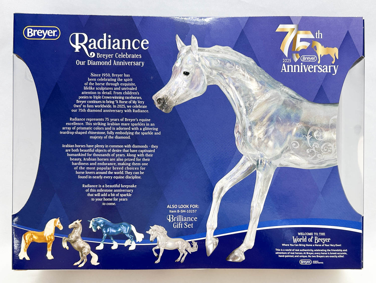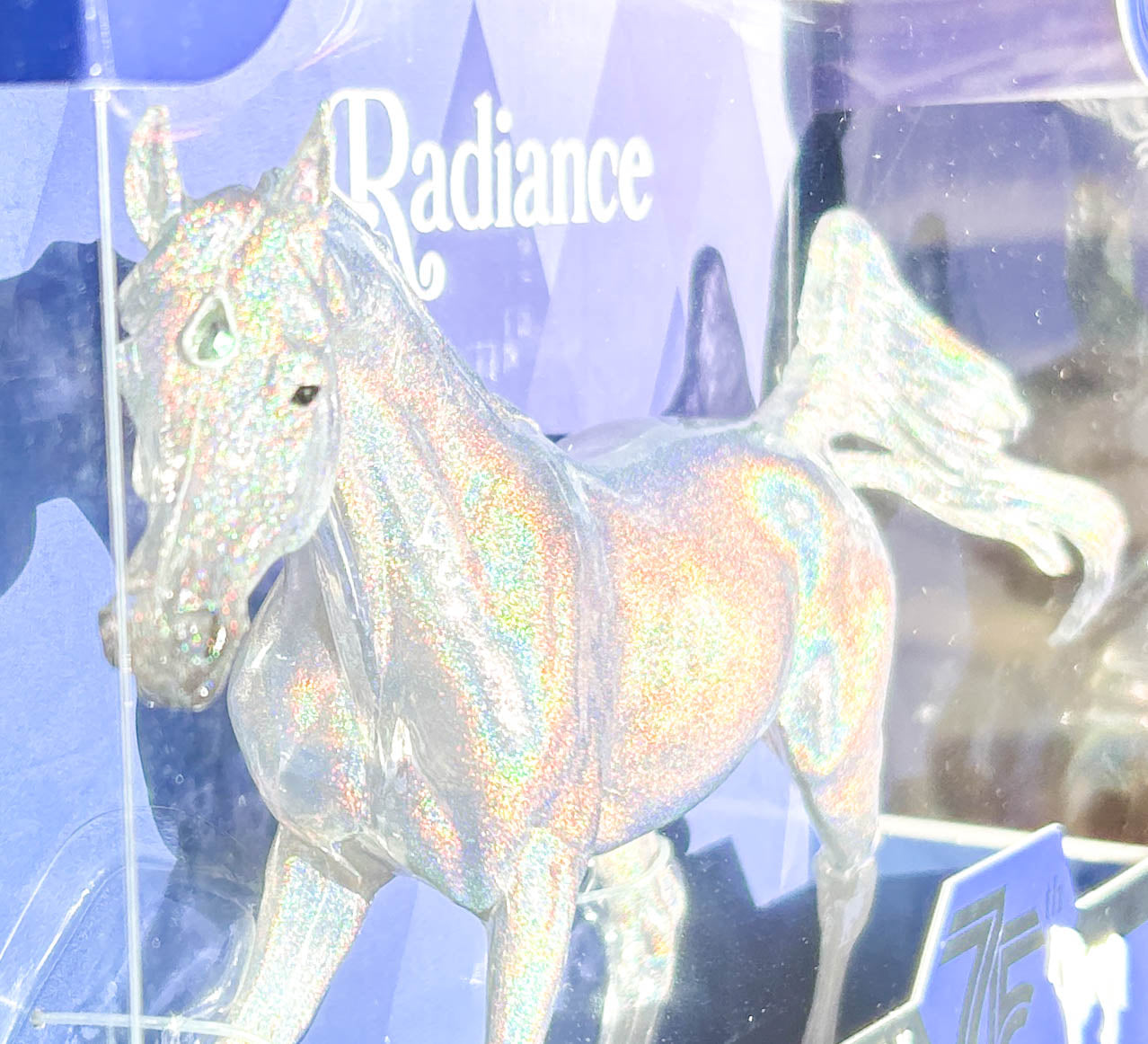 Radiance shines like a diamond! A perfect keepsake for Breyer's 75th Anniversary, the Playful Arabian mare is done in clearware with prismatic sheen and elegant "etched" scrollwork patterning, with a glittering teardrop rhinestone on her forehead. Take her out into the sunshine and watch her coat come alive with rainbows! She comes in a special 75th Anniversary box. She was a single-year release in 2025.