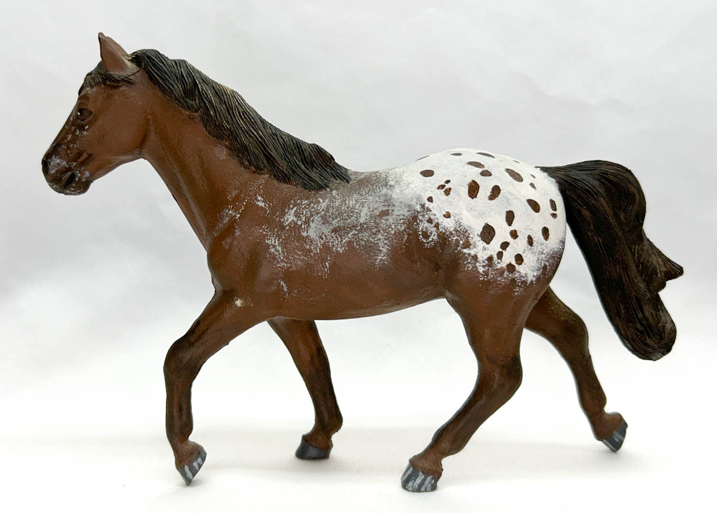This is a heavy plastic model with no mold mark.  A series of four different breeds was originally available, sold as unpainted tan plastic for you to paint yourself, and included a painting guide and paints, in the late 1980s, approximately.  This is the Pony of the Americas, and she was painted by Eleda when she got her new from the store back then.  She's ready for a new home, and perhaps a more modern paint job.