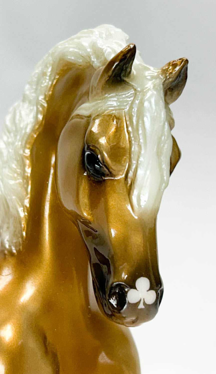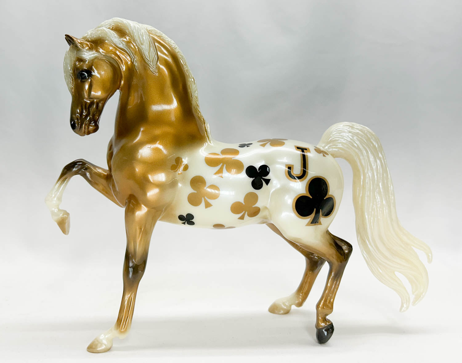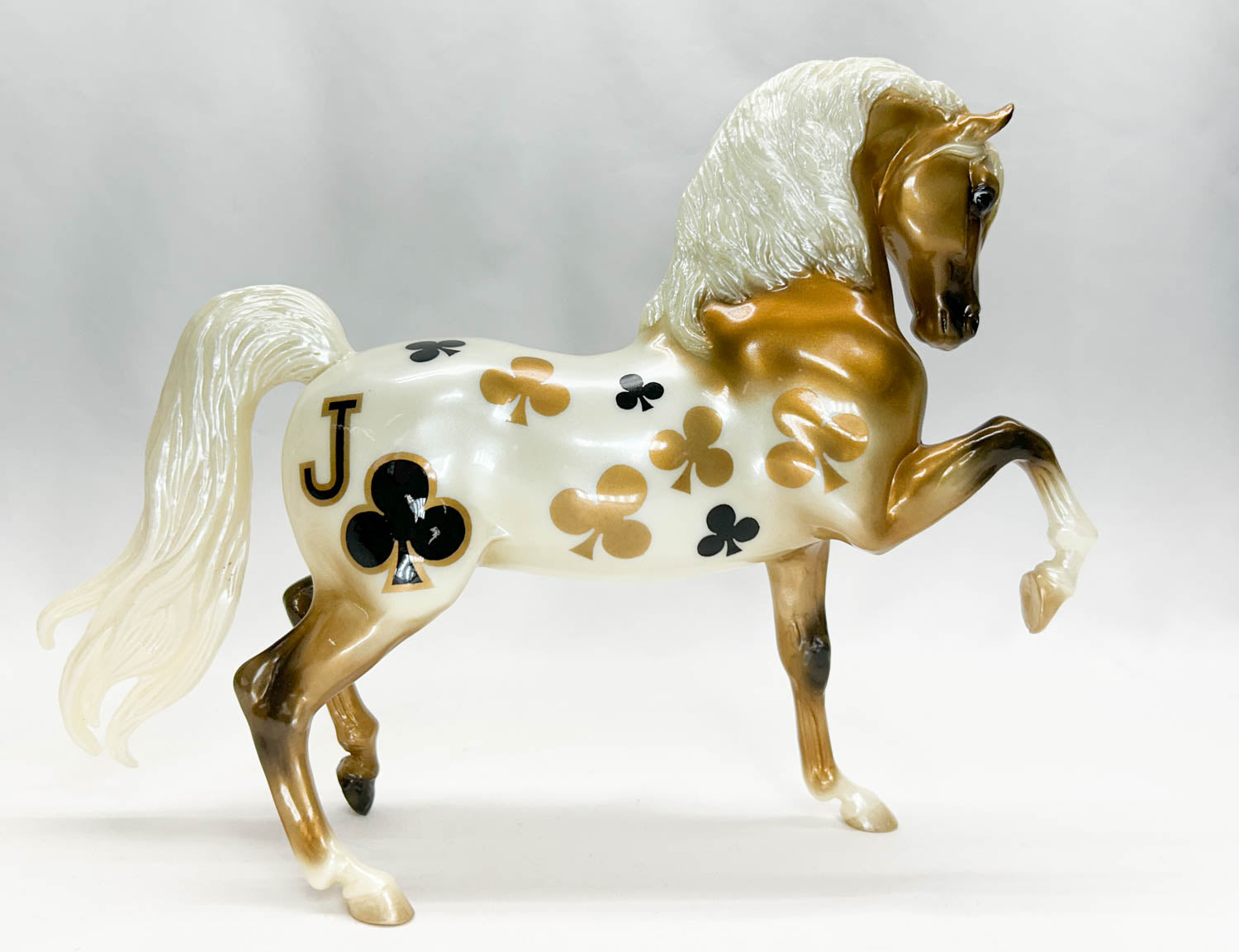 With only 100 of each pattern of Joker's Wild made (and only 2 Jokers), this guy is a Grail for a lot of collectors. They almost never come up for sale anywhere, because with this combination of rarity and beauty, once someone has one, they don't let him go. This run was only available to members of Breyer's Connoisseur Club in 2005, and they were shipped Gambler's Choice style to members inside a velvet drawstring pouch.