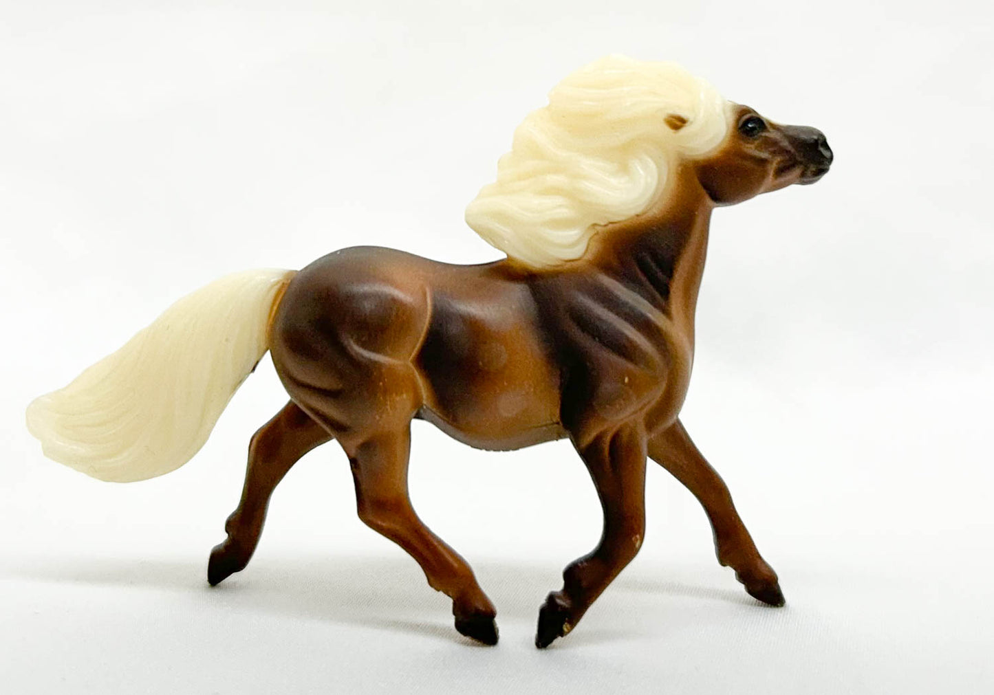 1998 was an exciting year for Breyer collectors, as it came with this introduction of a whole new set of twelve Stablemate molds - the first new ones since the scale was introduced in 1975. Only 5000 sets were made, available only to "Just About Horses" magazine subscribers, and each set was numbered. That set marked the debut of the Shetland Pony mold, and he wore a chocolate palomino / silver dapple coat for this release. He's just about impossible to find nowadays.