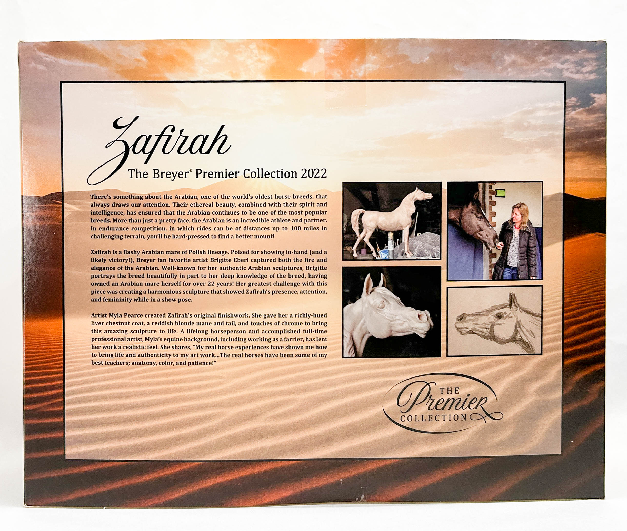 Zafirah is an elegant show-stance Arabian mare sculpted by Brigitte Eberl. She wears a deep liver chestnut coat with subtle dapples, three socks and a coronet, ermine spots over striped feet, and a star and snip, complete with kissing spots. She's just as beautiful as her Breyer promo photos! She's sure to become a big hit with collectors. She was only available to Premier Club members in early 2022.