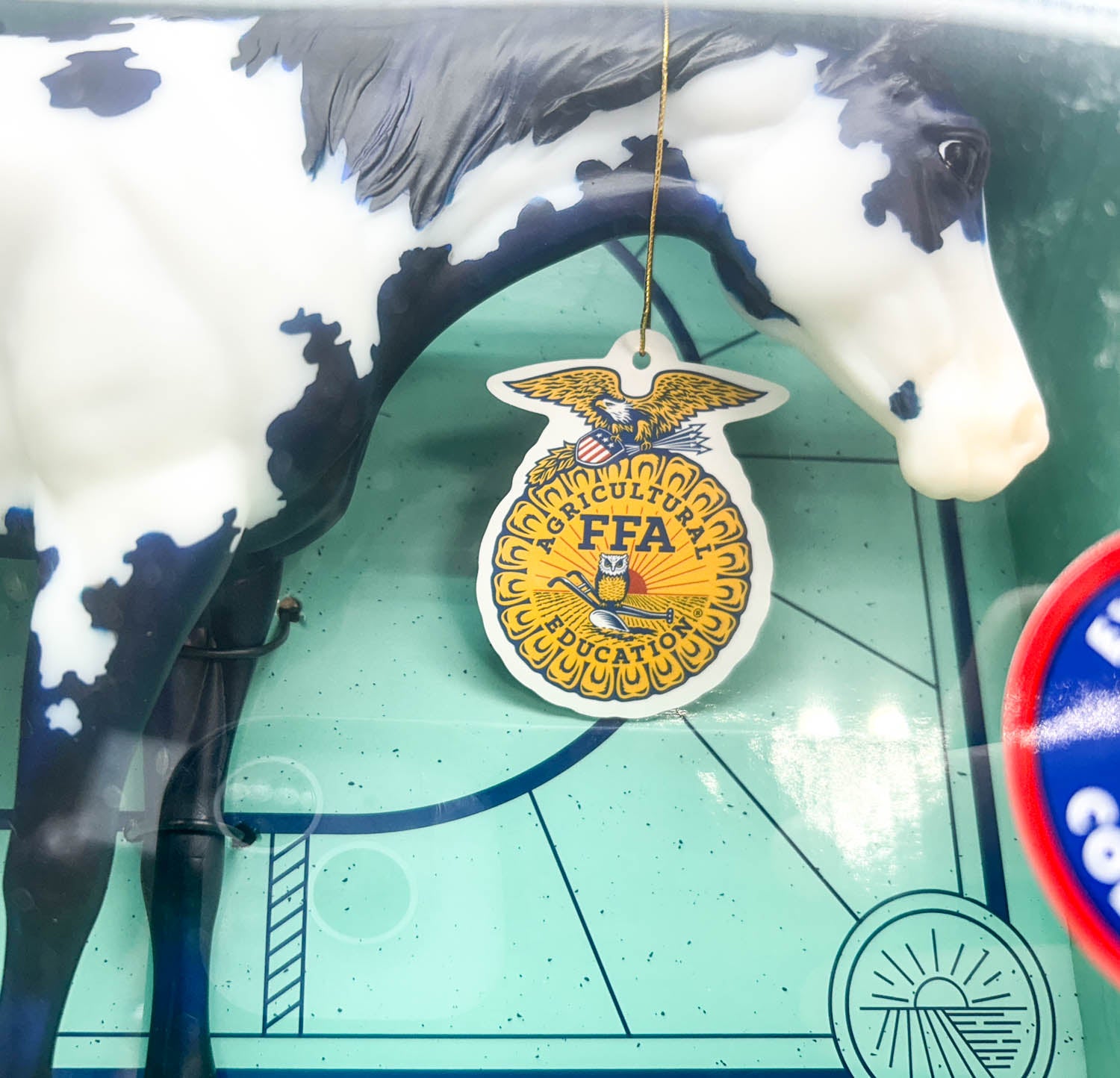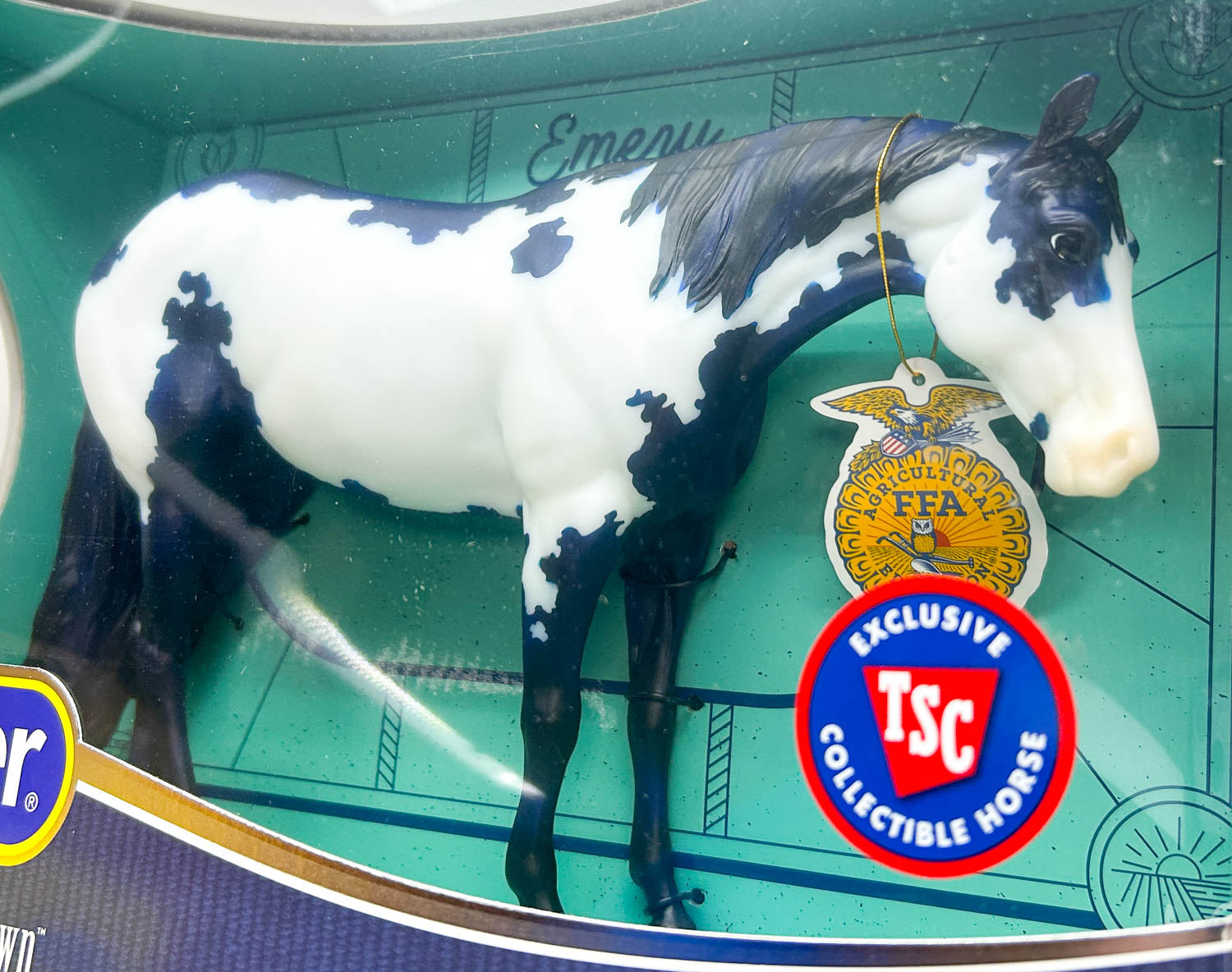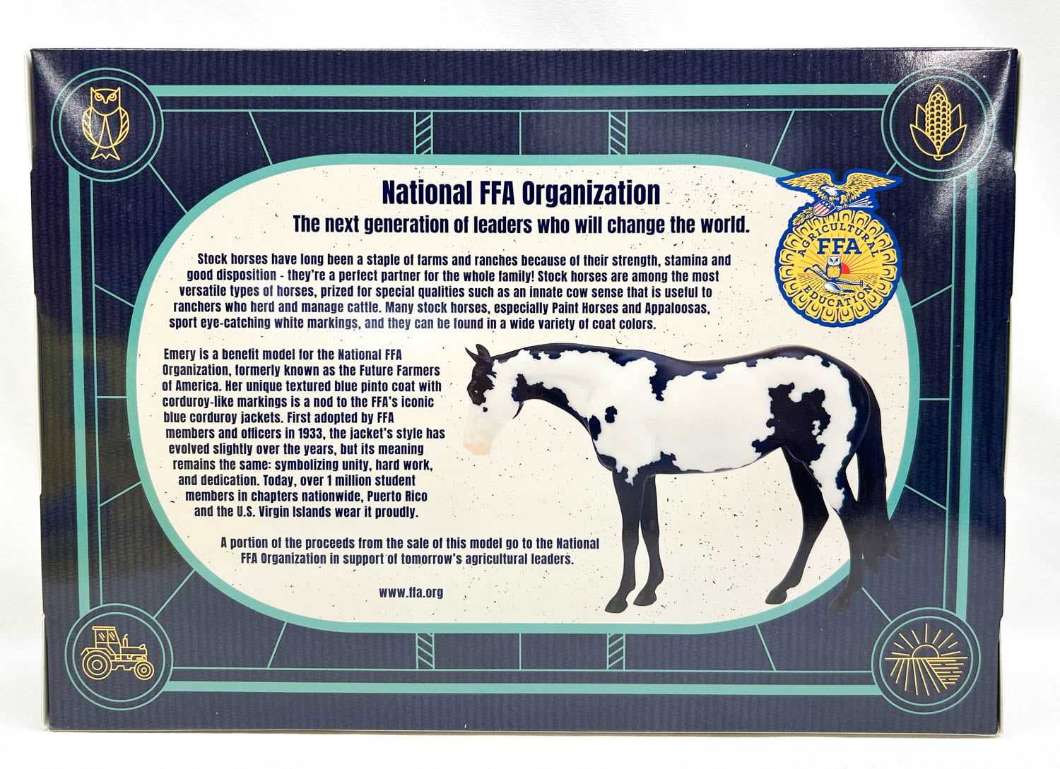 Emery is 2025's Future Farmers of America benefit model, with a portion of their original sale price going to FFA to help the next generation learn to be responsible farmers. Emery continues the tradition of FFA models with her dark blue denim coat, this time decorated with a frame overo pinto pattern. What a pretty girl!