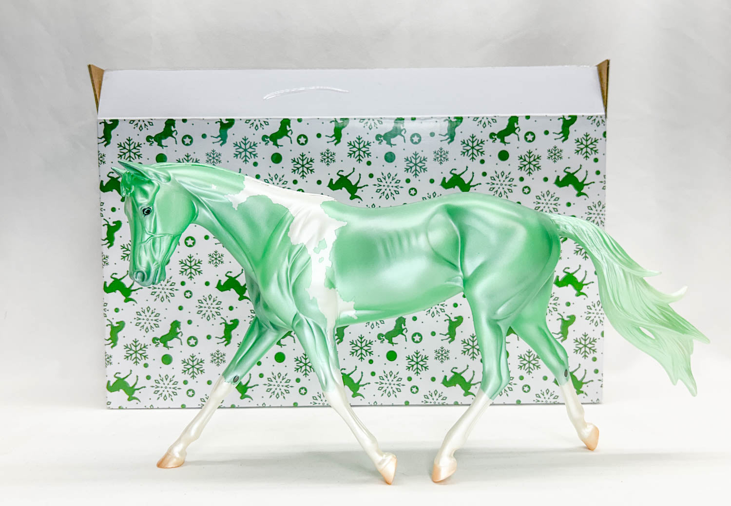 This elegant lady is the soft mint green pinto. She is Factory Mint, straight from Breyer to us. She features a pearly coat that makes her shimmer, and wears a little star. She'll come with her original Breyer holiday shipping box.