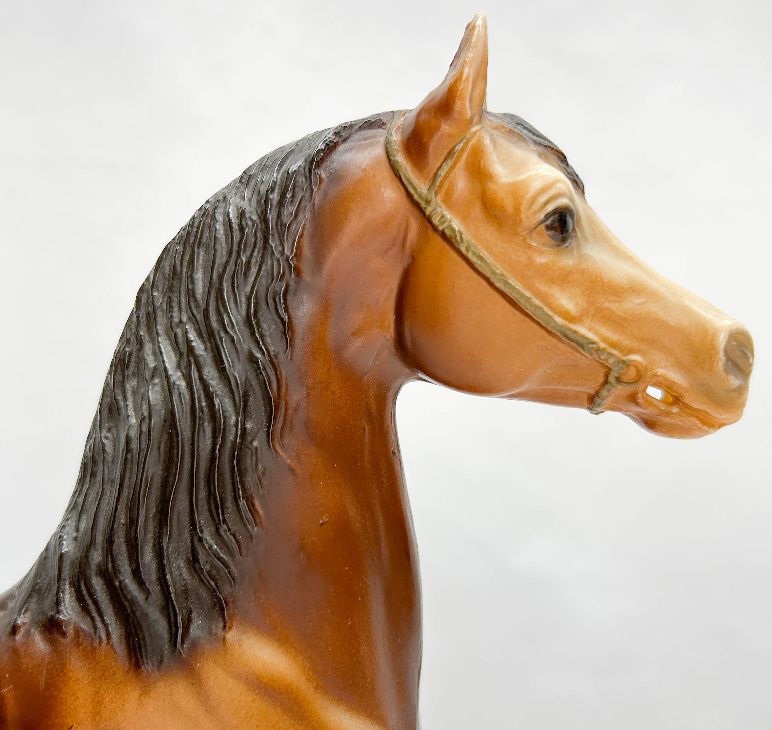 This fellow is in Excellent condition with mild age yellowing, tiny eartip and hoof edge rubs, a tiny rub on his left knee, and a few pinpoint rubs. He displays beautifully, with a speckly paint job and soft highlights. No USA mark.