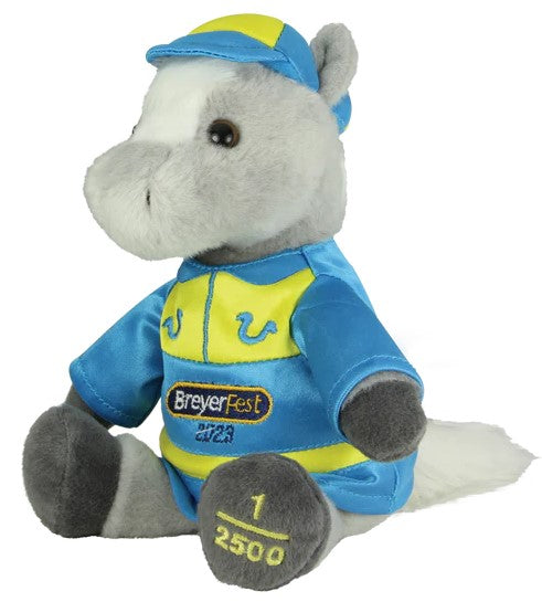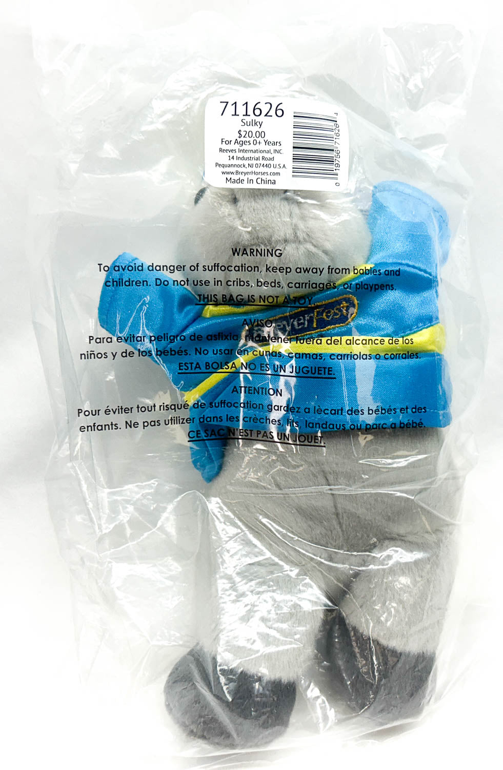 Sulky is a sweet grey with a white blaze, dressed in his finest silks. He was a numbered Special Run for BreyerFest in 2023, with only 2500 made.