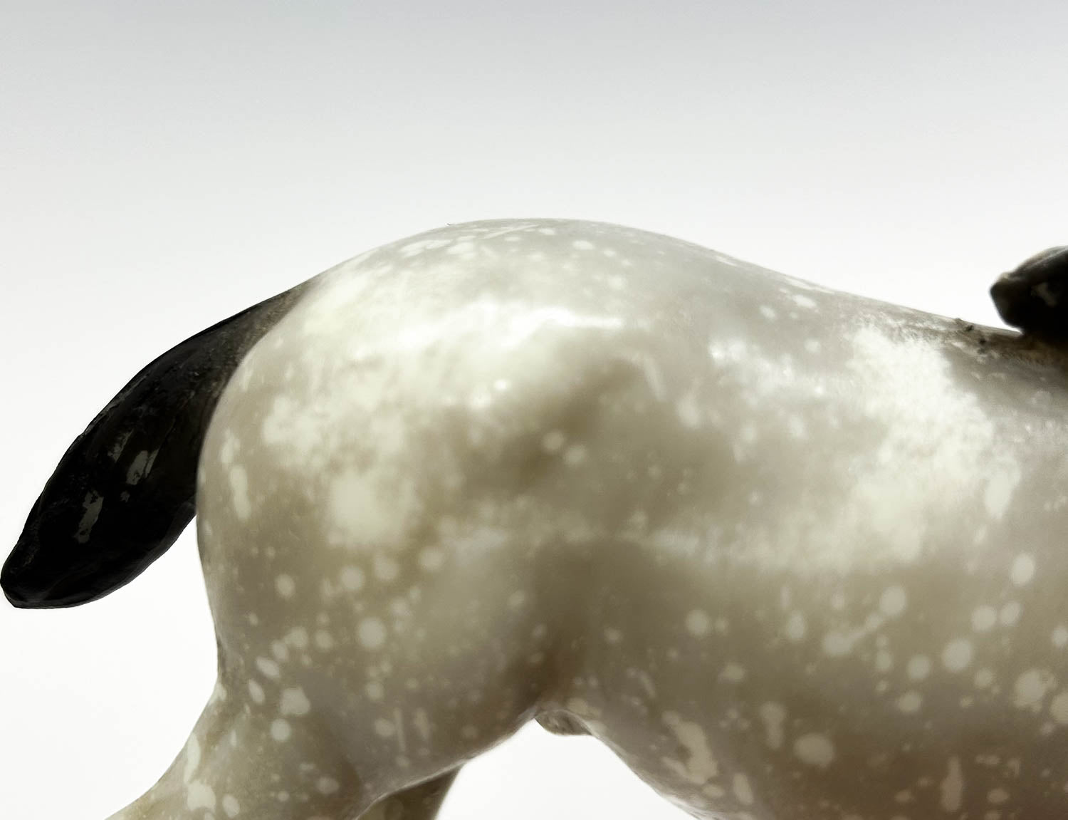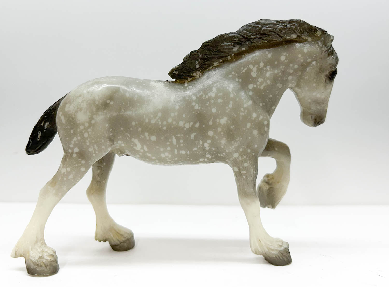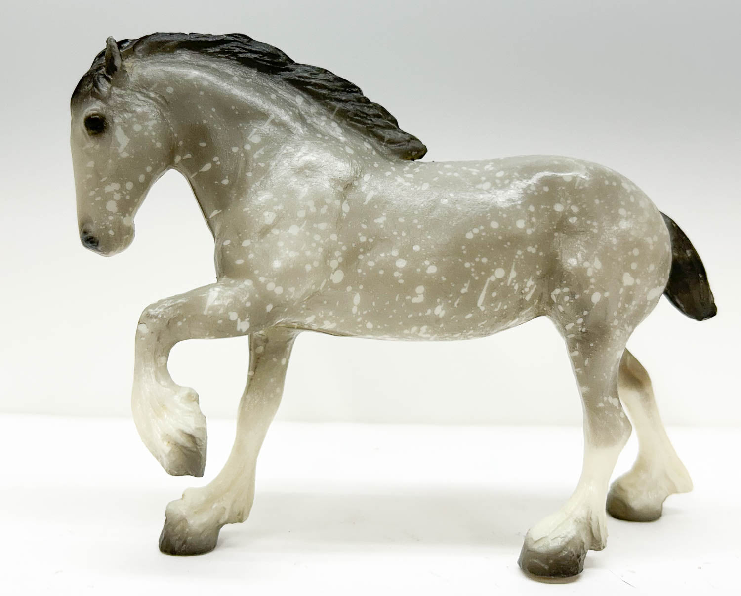 This stunning dapple grey drafter was only sold through JC Penney as part of their Parade of Breeds II set in 1990. Only 8500 were made. Sometimes there are mistaken for the "Charger - The Great Horse" release, but that release had far fewer dapples and a matte finish, while this release is beautifully dappled and wears a semigloss finish. Because of their beautiful coloring, they are very sought-after and rarely come up for sale.