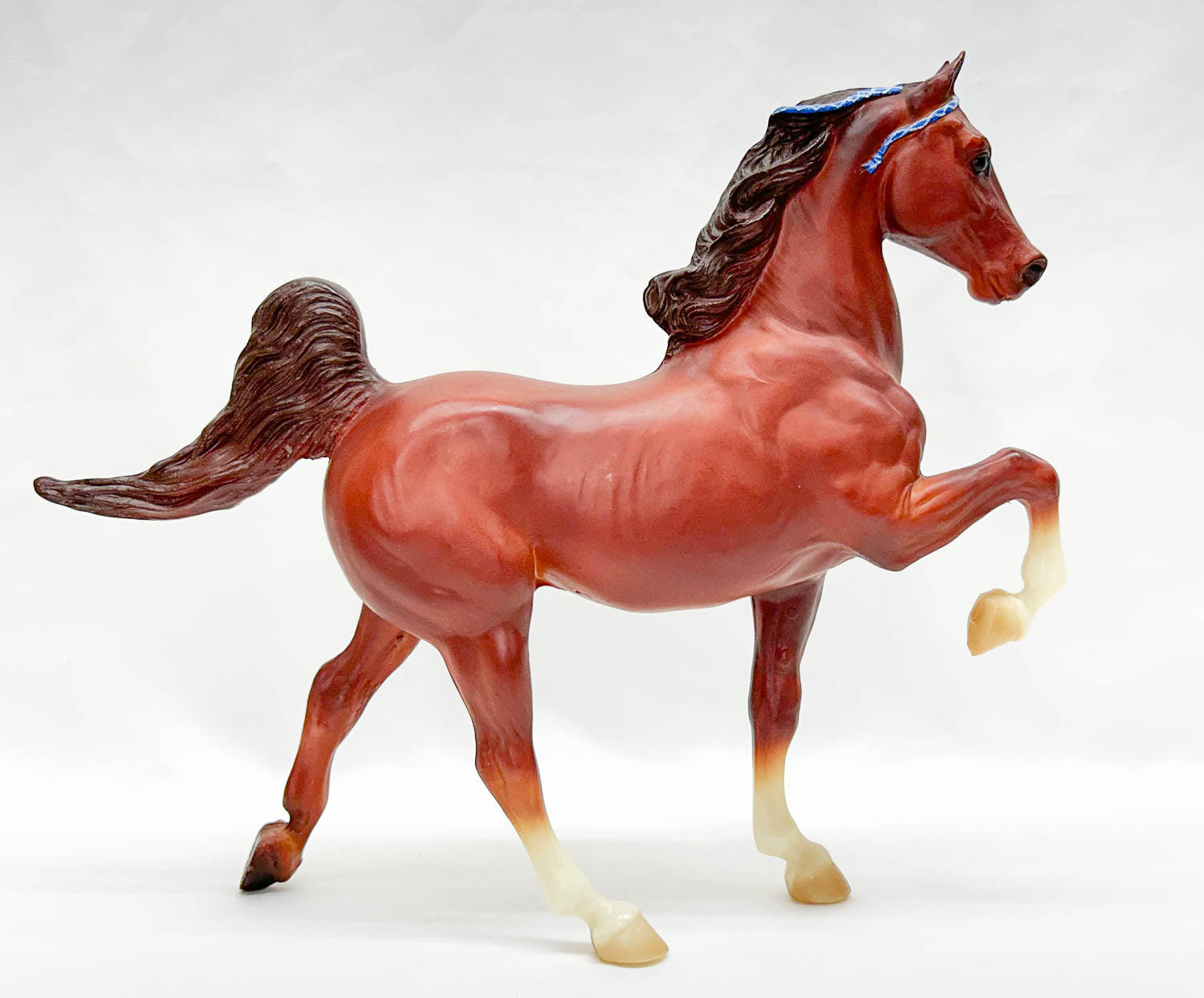 This rich chestnut on the Five Gaiter mold was a two-year release called "Kentucky Saddlebred. He wears three socks, a stripe, and white-on-blue ribbons, and was only made in 1992-1993.