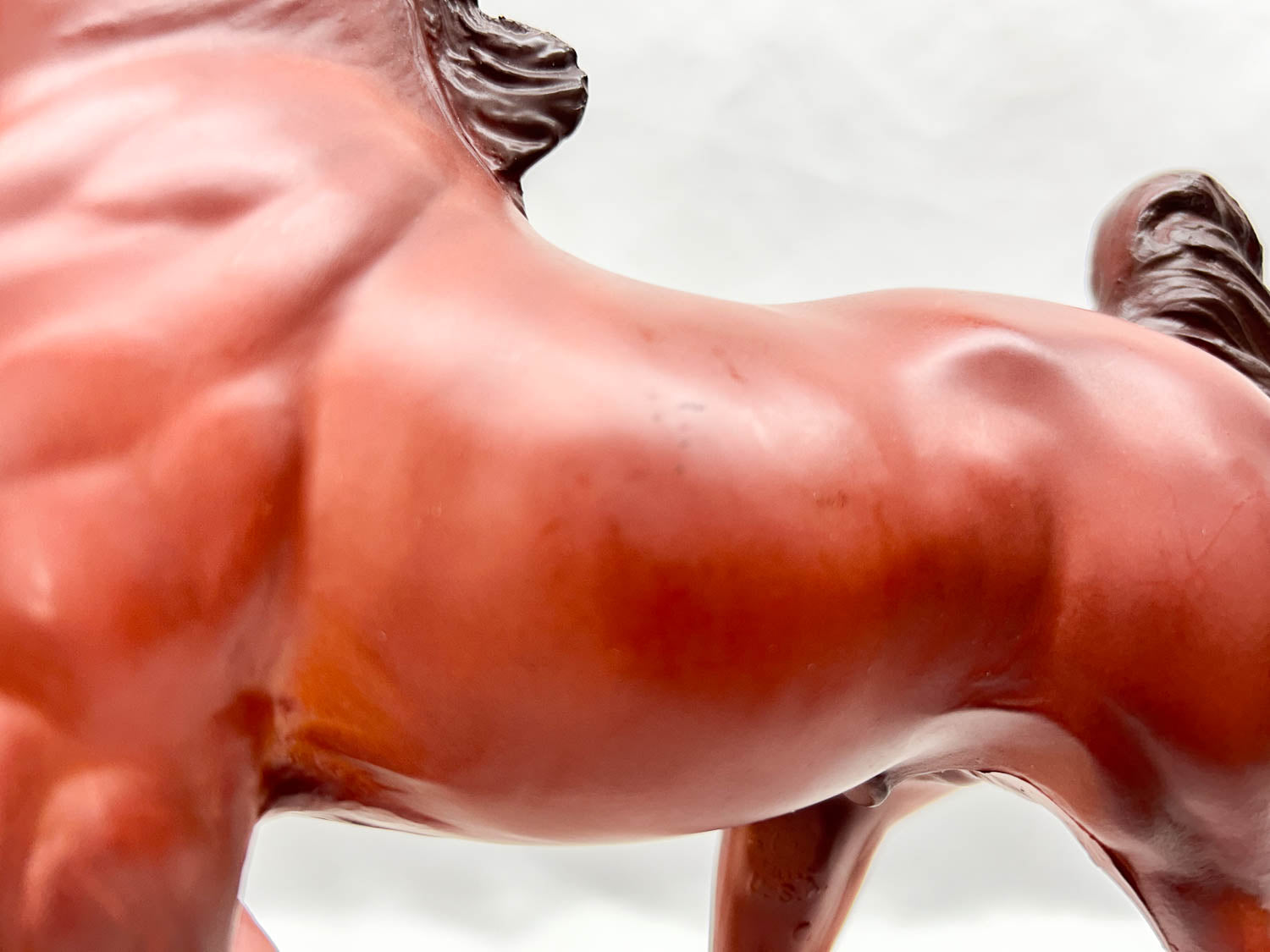 This fellow is Excellent condition with a tiny rub inside his right hock, a missed spot on the back of his left hind heel, and a few tiny black bits of paint stuck on his left barrel. He would benefit from a good bath because he was rinsed before shipping to us, but not wiped down, so the dust simply re-settled as "muddy" spots. He features a pretty face and whites almost as bright as the day he was born. He's pretty tippy, so we recommend Museum Putty or a Horse Safety Rack to keep him safely upright.